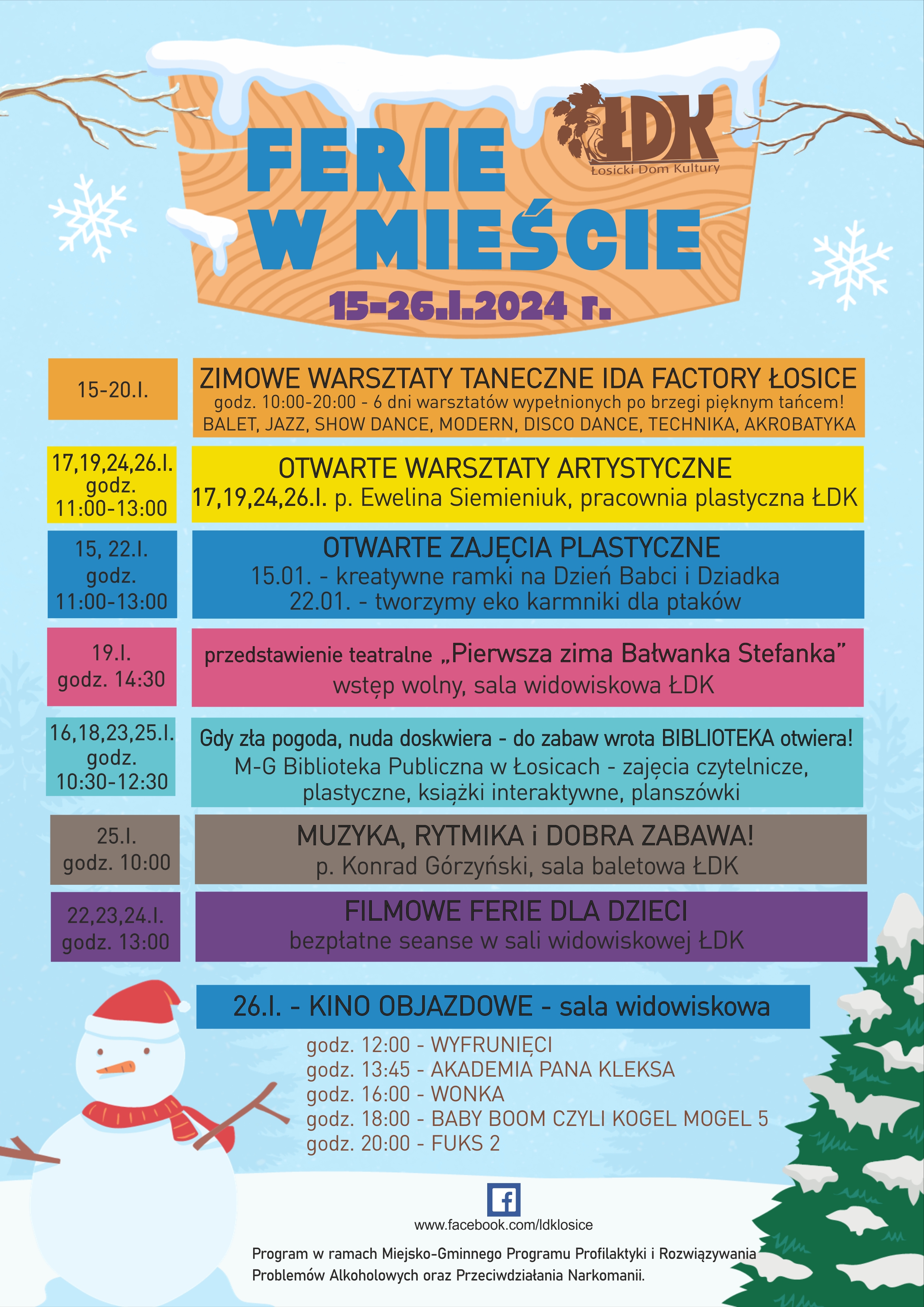 Od poniedziałku, 15 stycznia w województwie mazowieckim rozpoczną się ferie zimowe. W tym czasie ośrodki kultury będą organizować dla dzieci i młodzieży zajęcia i różnego rodzaju warsztaty. Na moc atrakcji można liczyć w Łosicach.