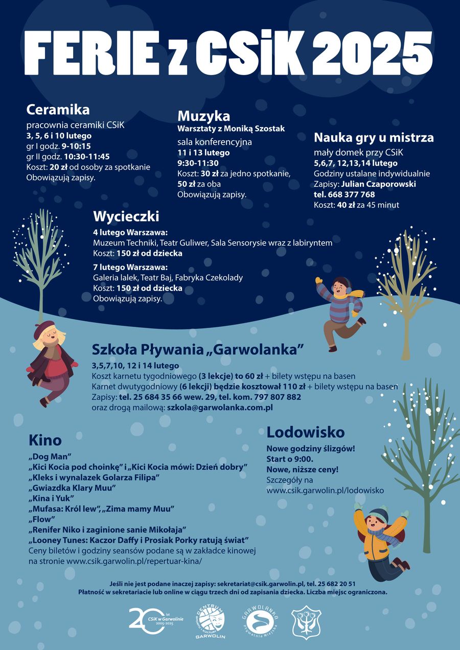 Obie propozycje wycieczek dotyczą Warszawy i odbędą się w pierwszym tygodniu ferii zimowych. Koszt jednej wycieczki to 150 zł od dziecka. Obejmuje on: bilety, przewodników, przejazd oraz ubezpieczenie. Zapisy prowadzi sekretariat. Płatności za wycieczkę można dokonać stacjonarnie lub online na konto w ciągu trzech dni od zapisu. Liczba miejsc jest ograniczona. Punkt zbiórki i odbioru dzieci to parking przy Pływalni Miejskiej „Garwolanka”. Wycieczki adresowane są do dzieci w wieku 6-10 lat.