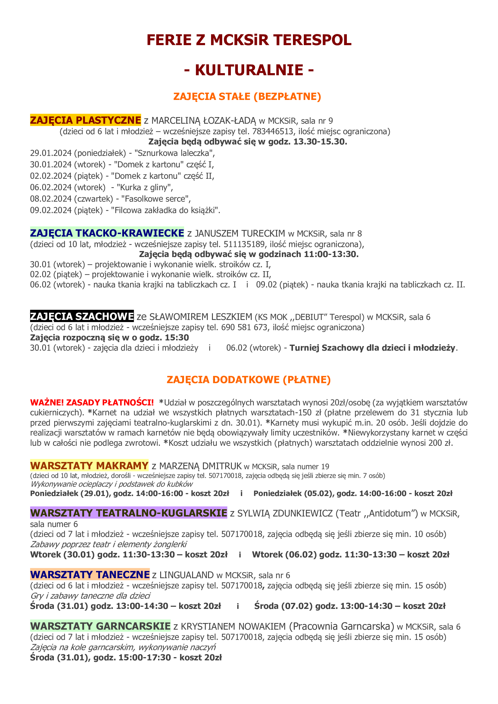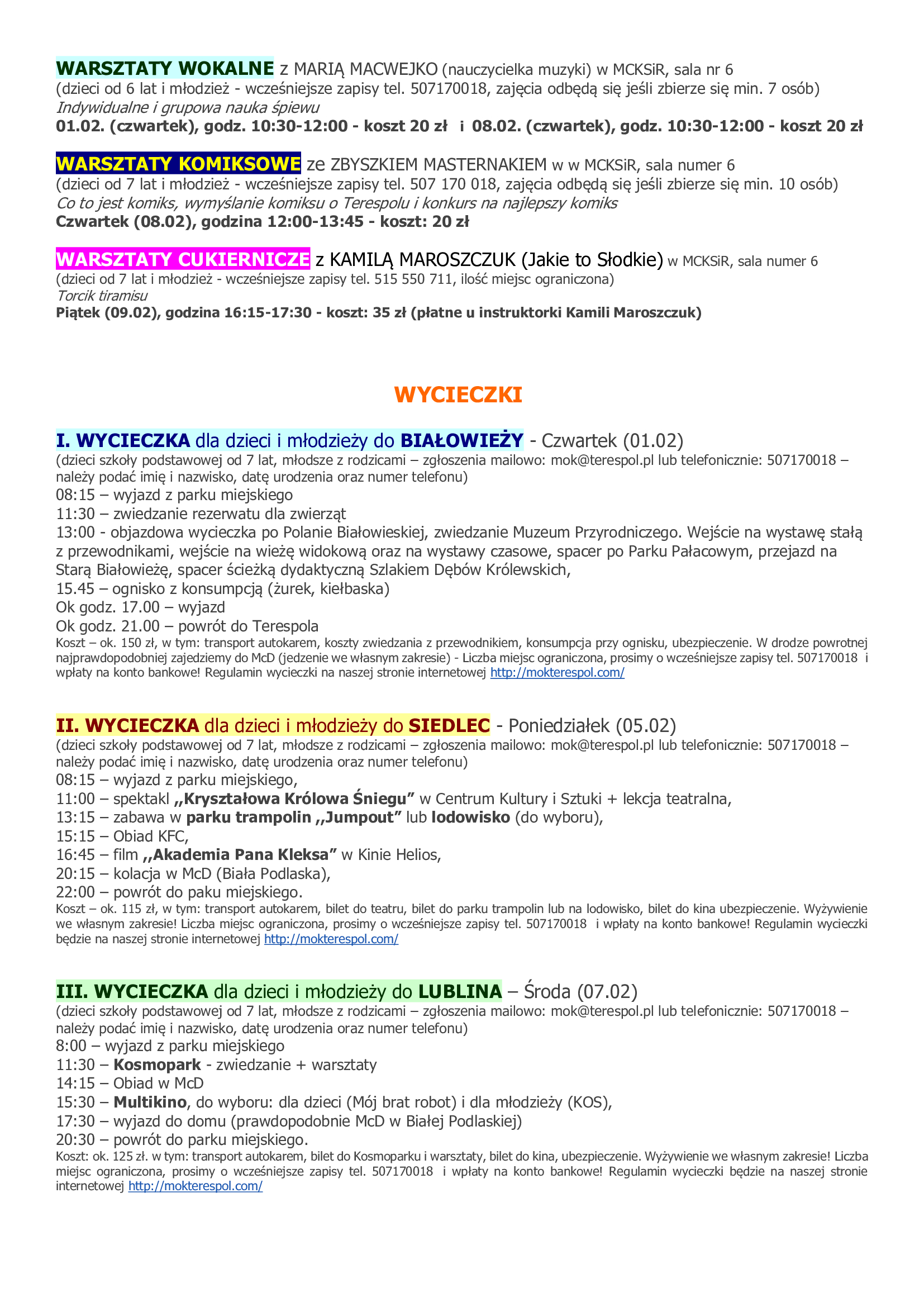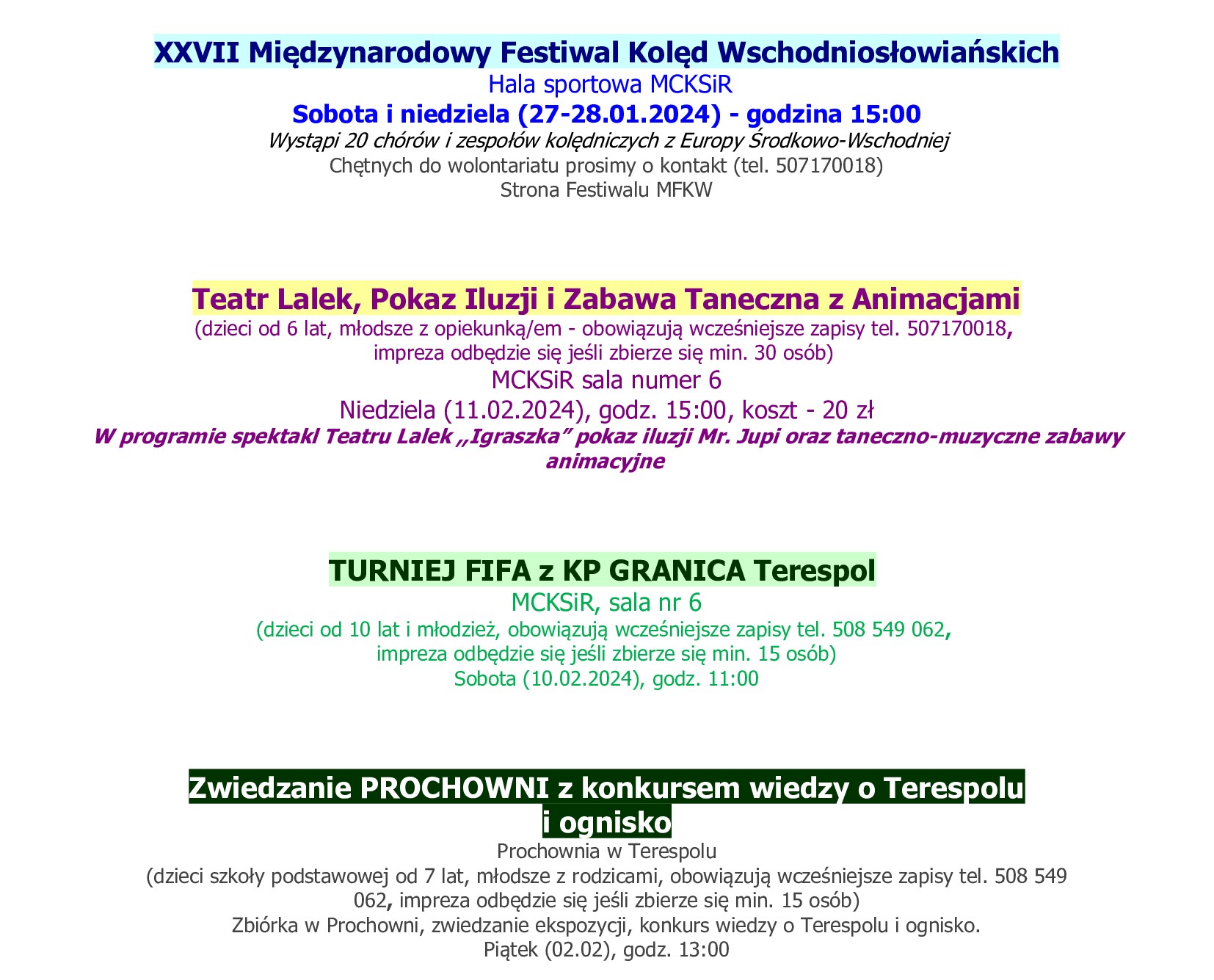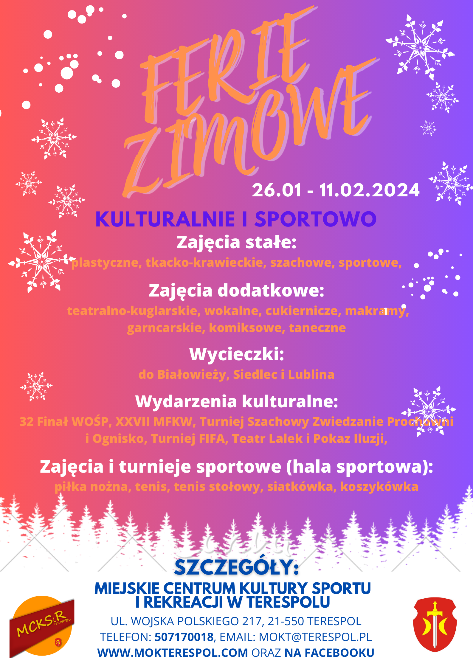 Miejskie Centrum Kultury Sportu i Rekreacji w Terespolu na okres ferii stworzyło bogatą ofertę. W programie zaplanowano wiele zajęć, warsztatów, wycieczek, wydarzeń i turniejów sportowych. Pierwsze spotkanie odbędzie się już w poniedziałek, 29 stycznia.