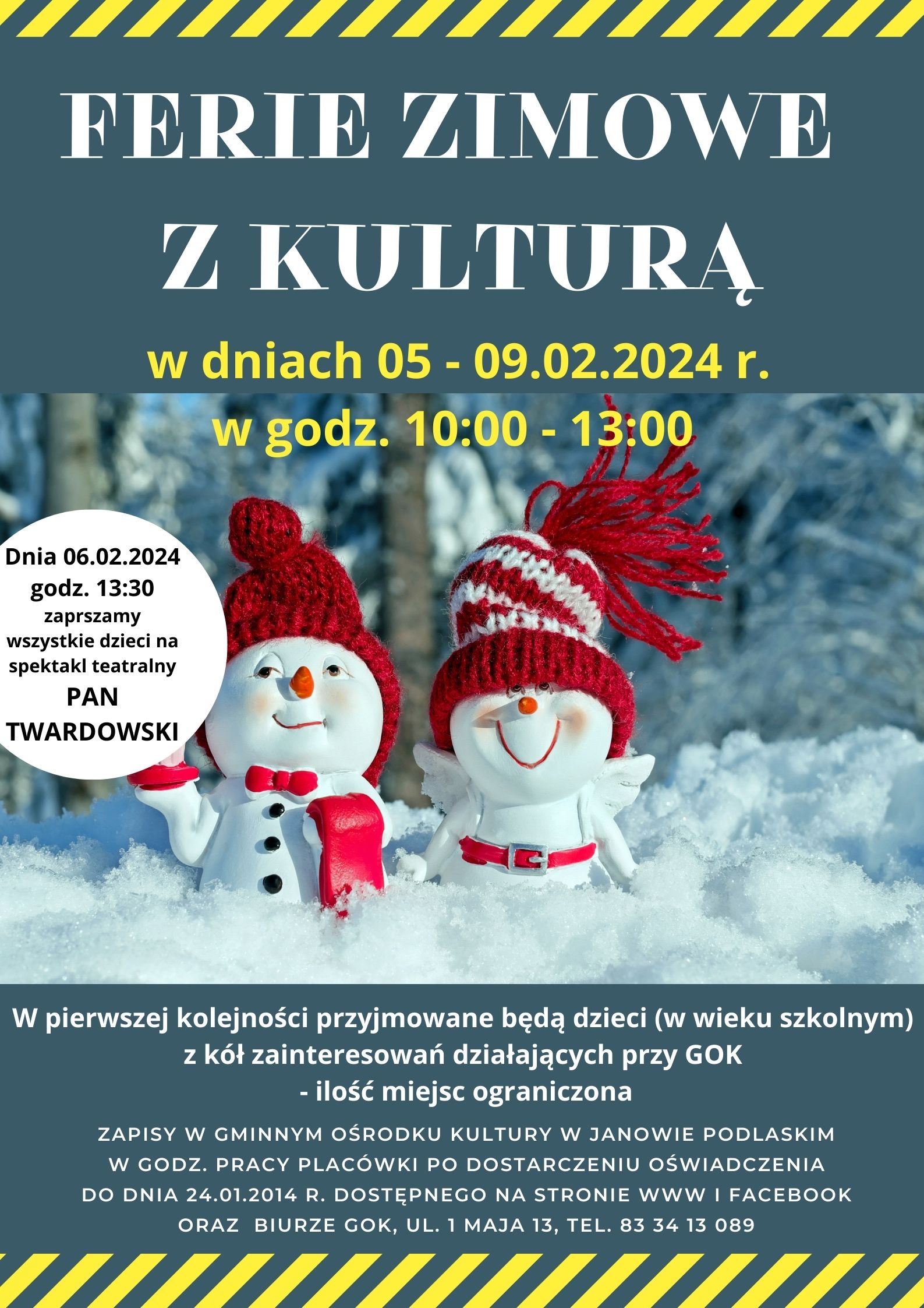 Gminny Ośrodek Kultury w Janowie Podlaskim przygotował na okres ferii ofertę zajęć dla dzieci w wieku szkolnym. Warsztaty odbędą się w dniach 5-9 luty w godzinach 10:00-13:00. Oprócz zajęć zaplanowano również spektakl teatralny „Pan Twardowski”.