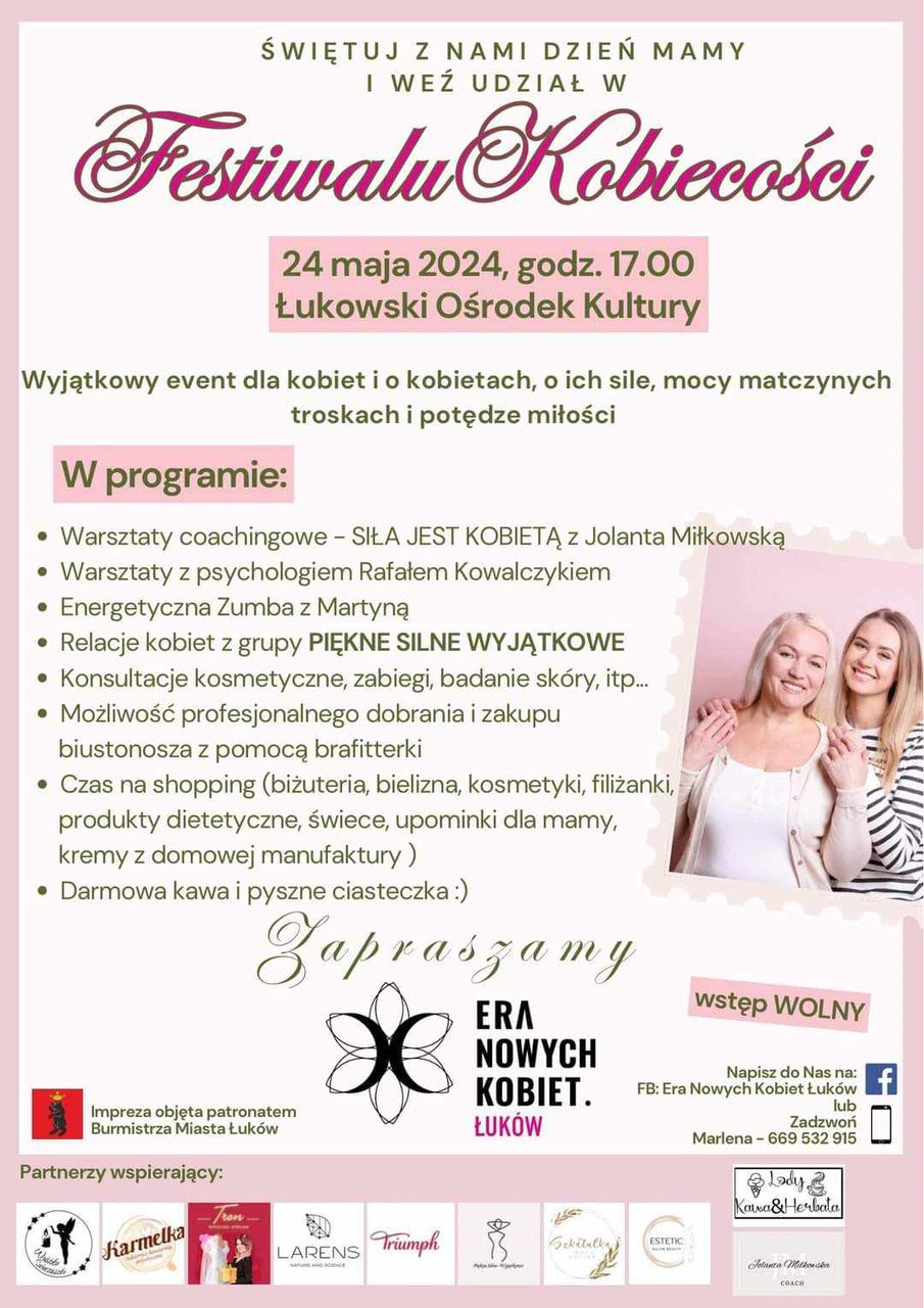 Łukowskie stowarzyszenie „Era Nowych Kobiet” organizuje Festiwal Kobiecości. Odbędzie się on w piątek, 24 maja w Łukowskim Ośrodku Kultury. Okazją do jego zorganizowania jest zbliżający się Dzień Mamy.