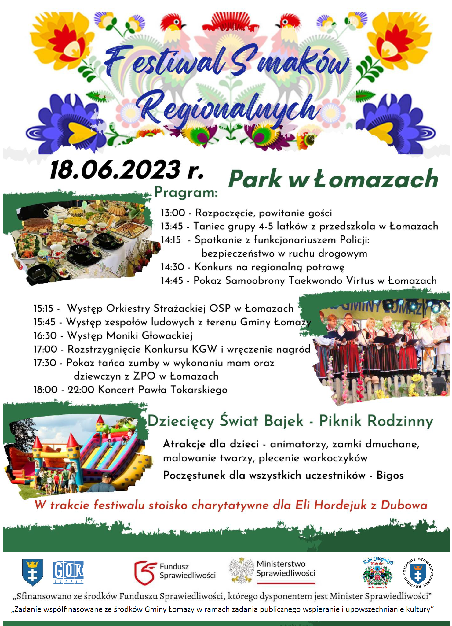W niedzielę, 18 czerwca w Parku w Łomazach odbędzie się Festiwal Smaków regionalnych. Podczas wydarzenia wystąpi wielu lokalnych artystów. Organizatorzy zaplanowali również konkursy i różne atrakcje dla dzieci. Festiwal rozpocznie się o godzinie 13:00.