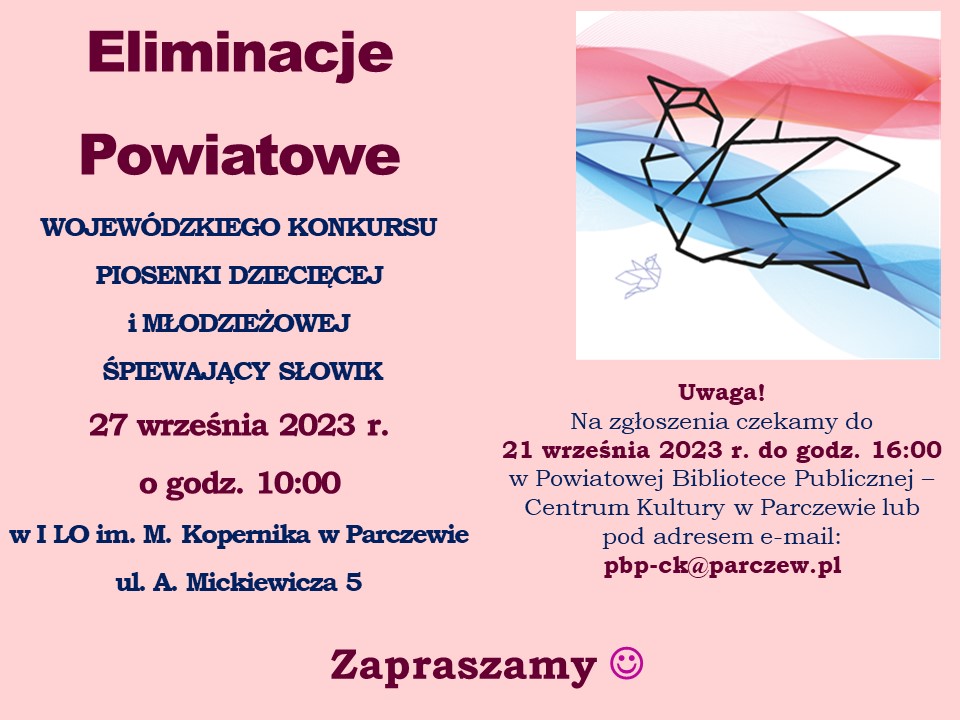 Już 27 września o godzinie 10.00, w I Liceum Ogólnokształcącym im. Mikołaja Kopernika w Parczewie, odbędą się Eliminacje Powiatowe do Wojewódzkiego Konkursu Piosenki Dziecięcej i Młodzieżowej ,,Śpiewający Słowik”.