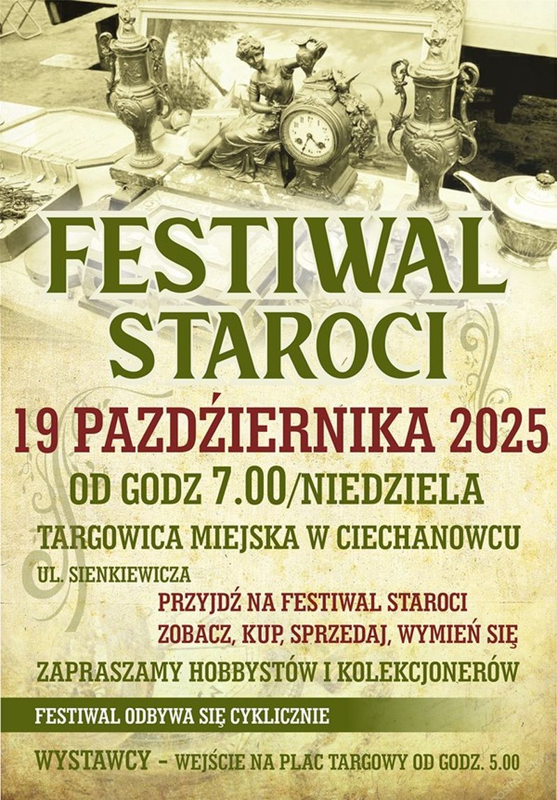 Na hasło „Festiwal Staroci” do Ciechanowca zjeżdżają z różnych stron kraju hobbyści, kolekcjonerzy i miłośnicy przedmiotów z duszą. To wyjątkowe wydarzenie, które na stałe wpisało się w kalendarz miejskich atrakcji. Kolejny Festiwal odbędzie się już w niedzielę, 19 października na Targowisku Miejskim w Ciechanowcu.