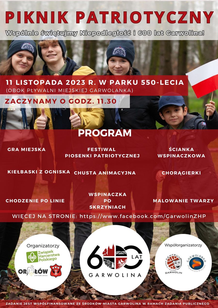 - Gorąco zapraszam, by razem z harcerzami uczcić 105. rocznicę odzyskania przez Polskę Niepodległości, oraz 600-lecie miasta Garwolina. To już trzecia edycja pikniku organizowanego przez ZHP – wydarzenia, które na stałe weszło do miejsko-powiatowych uroczystości Narodowego Święta Niepodległości. Radośnie, rodzinnie i z uśmiechem świętujmy 11 listopada – zachęca burmistrz Garwolina Marzena Świeczak.