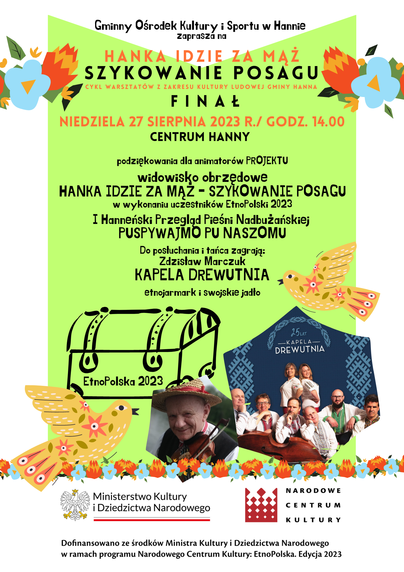 Wszystko było możliwe dzięki dofinansowaniu ze środków Ministra Kultury i Dziedzictwa Narodowego w ramach programu Narodowego Centrum Kultury: EtnoPolska. Edycja 2023 oraz współpracy z Wójtem Gminy Hanna Grażyną Kowalik i Centrum Religijno-Zabytkowym w Hannie.