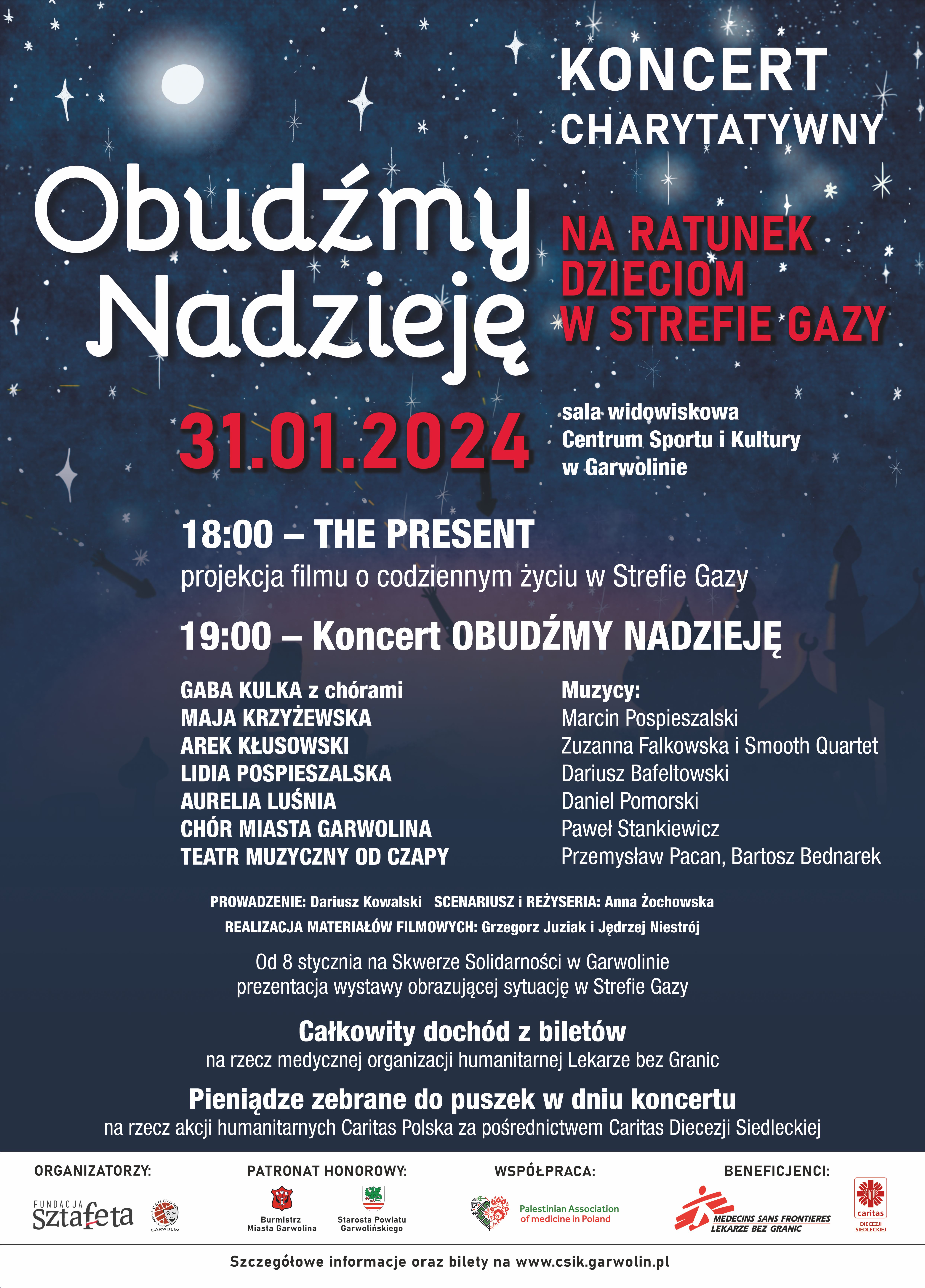 W dniu koncertu będą również zbierane do puszek pieniądze na rzecz akcji humanitarnych Caritas Polska za pośrednictwem Caritas Diecezji Siedleckiej. Między piosenkami będą prezentowane materiały filmowe ze Strefy Gazy i świadectwa naocznych świadków wydarzeń – osób z rodzin polsko-arabskich, którzy przeżyli tragedię, stracili swoich bliskich. Dodatkowo na głównym skwerze miasta prezentowana będzie wystawa pokazująca sytuację w Strefie Gazy.Bilety na koncert „Obudźmy nadzieję“ są do nabycia na stronie www.csik.garwolin.pl oraz sekretariacie Centrum Sportu i Kultury w Garwolinie. Organizatorami wydarzenia są: Fundacja Sztafeta oraz Centrum Sportu i Kultury w Garwolinie przy współpracy Stowarzyszenia Lekarzy Palestyńskich w Polsce, patronat honorowy sprawują Burmistrz Garwolina i Starosta Powiatu Garwolińskiego.