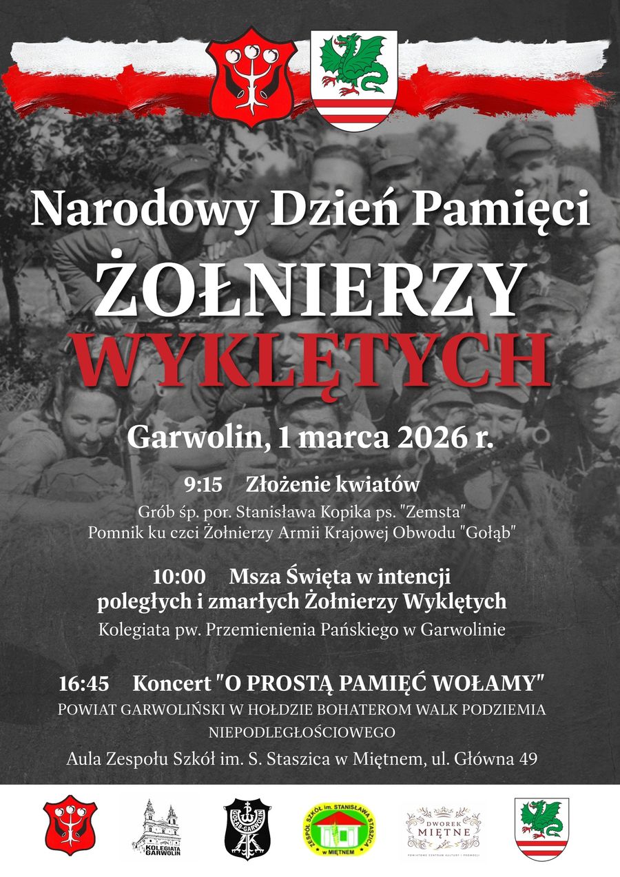 Narodowy Dzień Pamięci Żołnierzy Wyklętych obchodzony jest 1 marca. Tego dnia mieszkańcy Garwolina i Miętnego oddadzą hołd bohaterom antykomunistycznego podziemia, którzy po II wojnie światowej sprzeciwili się narzuconej Polsce władzy komunistycznej.Uroczystości rozpoczną się o godz. 9:15 na cmentarzu parafialnym w Garwolinie, gdzie delegacje złożą kwiaty i zapalą znicze na grobie por. Stanisława Kopika ps. „Zemsta” – żołnierza 1. Pułku Strzelców Konnych, oficera Wojska Polskiego, Armii Krajowej i Narodowych Sił Zbrojnych VII Okręgu Śląskiego. Po 74 latach od śmierci, 10 listopada 2022 roku, oficer spoczął na garwolińskim cmentarzu pod swoim prawdziwym nazwiskiem.
