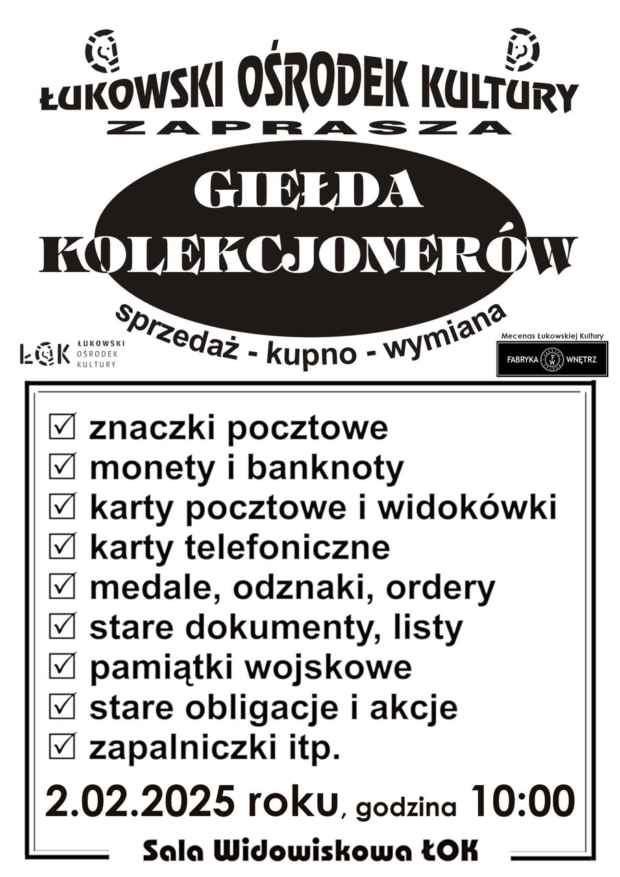 Giełda Kolekcjonerów to cykliczne targowisko, na którym można kupić, wymienić, obejrzeć oraz sprzedać znaczki pocztowe, monety i banknoty, karty pocztowe i widokówki, karty telefoniczne, medale, odznaki, ordery, stare dokumenty, listy, pamiątki wojskowe, stare obligacje i akcje, zapalniczki, zegarki, telefony, lampy i inne starocia.Spotkanie kolekcjonerów odbędzie się w niedzielę, 2 lutego w sali widowiskowej ŁOK. Początek spotkania godzina 10.00.