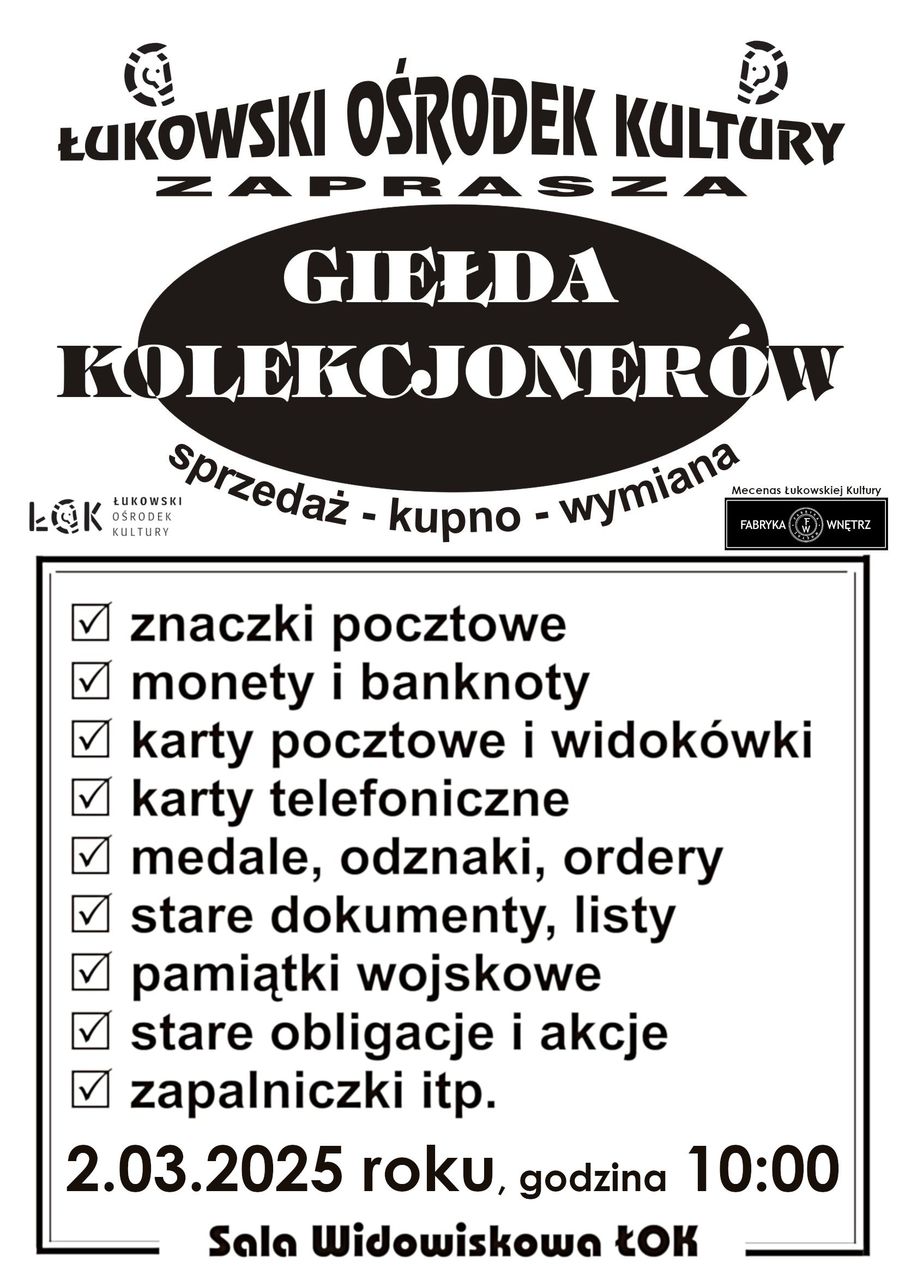 Giełda Kolekcjonerów to cykliczne targowisko odbywające się zawsze w pierwszą niedzielę nowego miesiąca. Można tam kupić, wymienić, obejrzeć oraz sprzedać znaczki pocztowe, monety i banknoty, karty pocztowe i widokówki, karty telefoniczne, medale, odznaki, ordery, stare dokumenty, listy, pamiątki wojskowe, stare obligacje i akcje, zapalniczki, zegarki, telefony, lampy i inne starocia.Trzecia już w tym roku Giełda Kolekcjonerów odbędzie się w niedzielę 2 marca w sali widowiskowej ŁOK. Początek godzina 10:00.