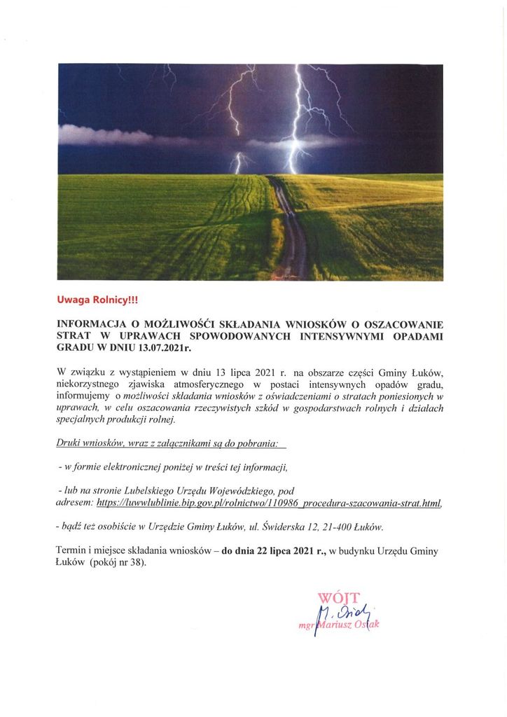 13 lipca nad powiatem łukowskim przechodziły burze. W gminie Łuków i w gminie Wojcieszków spadł grad. Niestety doszło do szkód w uprawach rolniczych i w związku z tym, w urzędach w gminach Łuków i Wojcieszków ruszył nabór wniosków od rolników, którzy ponieśli straty.Wnioski wraz z oświadczeniami o poniesionych szkodach rolnicy z gminy Łuków mogą składać do 22 lipca. W Wojcieszkowie terminu nie wyznaczono, ale jest apel do rolników, aby zrobili to możliwie jak najszybciej.