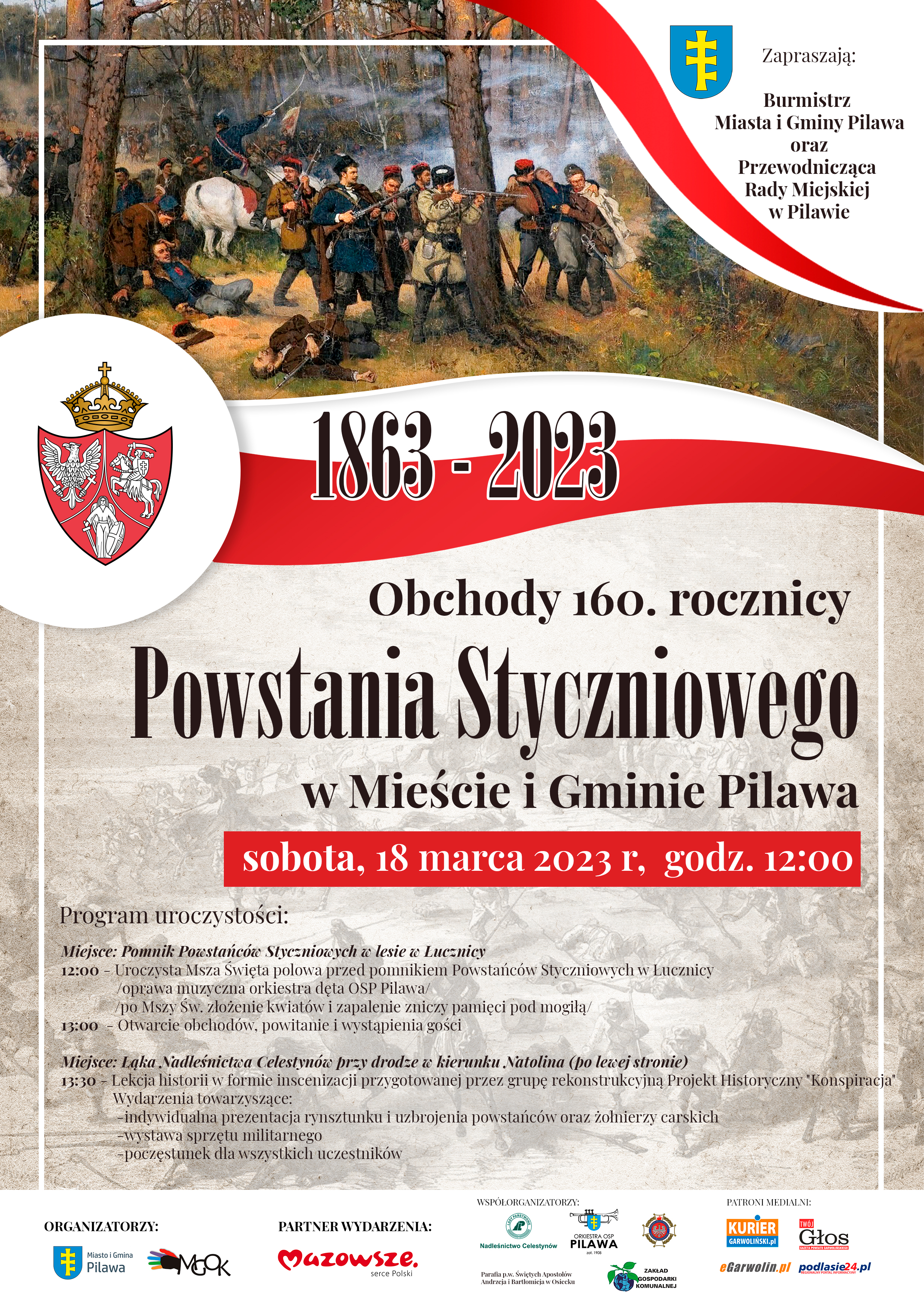 Powstanie Styczniowe było największym zrywem niepodległościowym w XIX wieku. Walki powstańców z Rosjanami trwały ponad rok, zginęło w nich około 30 tysięcy Polaków. Na terenie Gminy Pilawa, w mogile Powstańców Styczniowych, w lesie pomiędzy Łucznicą a Natolinem pochowanych zostało 46 powstańców, którzy polegli w boju, znienacka zaatakowani przez Rosjan podczas odpoczynku. Miało to miejsce 18 marca 1863 roku. Obchody upamiętniające 160. rocznicę tamtych wydarzeń zaplanowane są na sobotę 18 marca 2023 r.Szczegółowy program uroczystości: