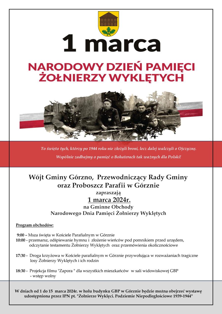 Żołnierze Wyklęci bronili niepodległego bytu państwa, sprzeciwiali się sowieckiej agresji i reżimowi komunistycznemu, który narzucono Polakom siłą. Liczbę członków organizacji i wszystkich grup konspiracyjnych szacuje się na 120-180 tysięcy osób. Ich odwaga upamiętniana jest 1 marca. To Narodowy Dzień Pamięci Żołnierzy Wyklętych. Data nie jest przypadkowa – przypada w rocznicę rozstrzelania członków IV Zarządu Zrzeszenia Wolność i Niezawisłość, którzy walczyli w obronie podstawowych praw obywateli, wolności oraz niezawisłości państwa polskiego. Egzekucja miała miejsce w 1951 roku w Warszawie, przy ulicy Rakowieckiej. Święto obchodzone jest od 2011 roku.Tegoroczne uroczystości upamiętniające Narodowy Dzień Pamięci Żołnierzy Wyklętych będą miały doniosły charakter. Obchody rozpoczną się 1 marca uroczystą Mszą św. o godzinie 09:00 w kościele parafialnym w Górznie.