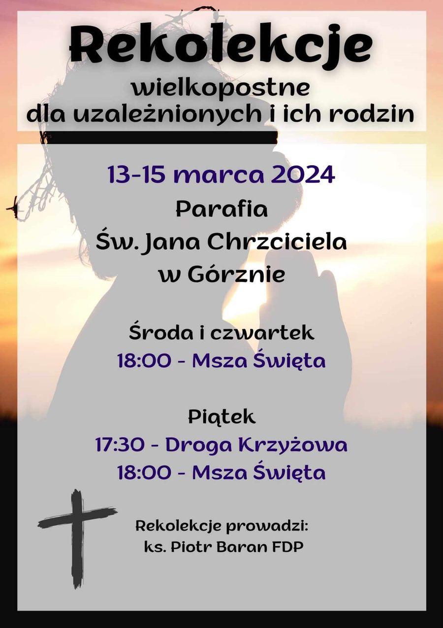 Rekolekcje dla osób uzależnionych od alkoholu i innych substancji psychotropowych oraz ich rodzin rozpoczną się w parafii św. Jana Chrzciciela w Górznie 13 marca o godzinie 18:00. Program rekolekcji: środa i czwartek o godzinie 18:00 Msza św. z nauką rekolekcyjną, w piątek o 17:30 Droga Krzyżowa, po której odbędzie się Msza św. z nauką rekolekcyjną i zakończenie rekolekcji, które prowadził będzie ks. Piotr Baran FDP.Na rekolekcje może przyjść każdy, nie tylko osoby uzależnione.
