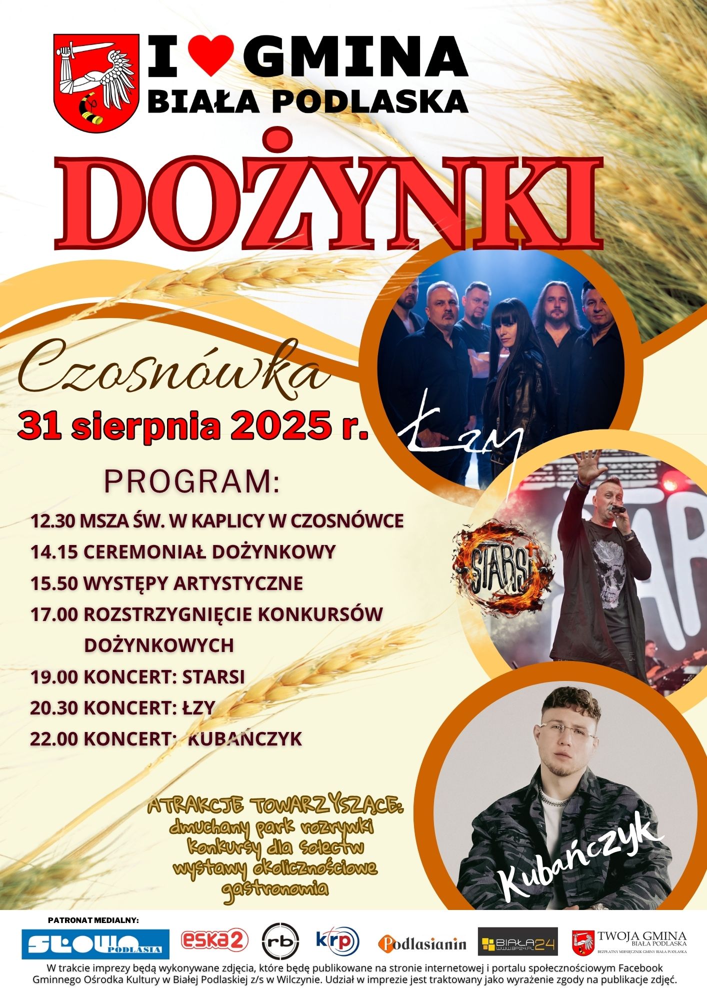 Od 15:50 na scenie pojawią się artyści, a o 17:00 poznamy zwycięzców dożynkowych konkursów. Wieczorem publiczność rozgrzeją gwiazdy: zespół Starsi, grupa Łzy i raper Kubańczyk.Na uczestników czekają także dodatkowe atrakcje, w tym konkurs sołectw, stoiska Kół Gospodyń Wiejskich, rękodzieło, dmuchańce dla dzieci oraz bogata strefa gastronomiczna.