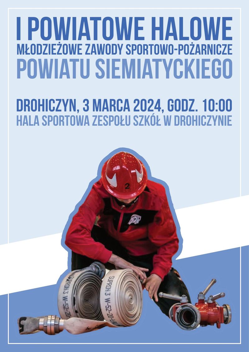 Zarząd Oddziału Powiatowego OSP RP powiatu siemiatyckiego, Komendant Powiatowy PSP w Siemiatyczach oraz Burmistrz Drohiczyna zapraszają do uczestnictwa w 1. Powiatowych Halowych Młodzieżowych Zawodach Sportowo-Pożarniczych, które odbędą się w niedzielę, 3 marca. To pierwsza edycja tego typu zawodów na terenie powiatu.