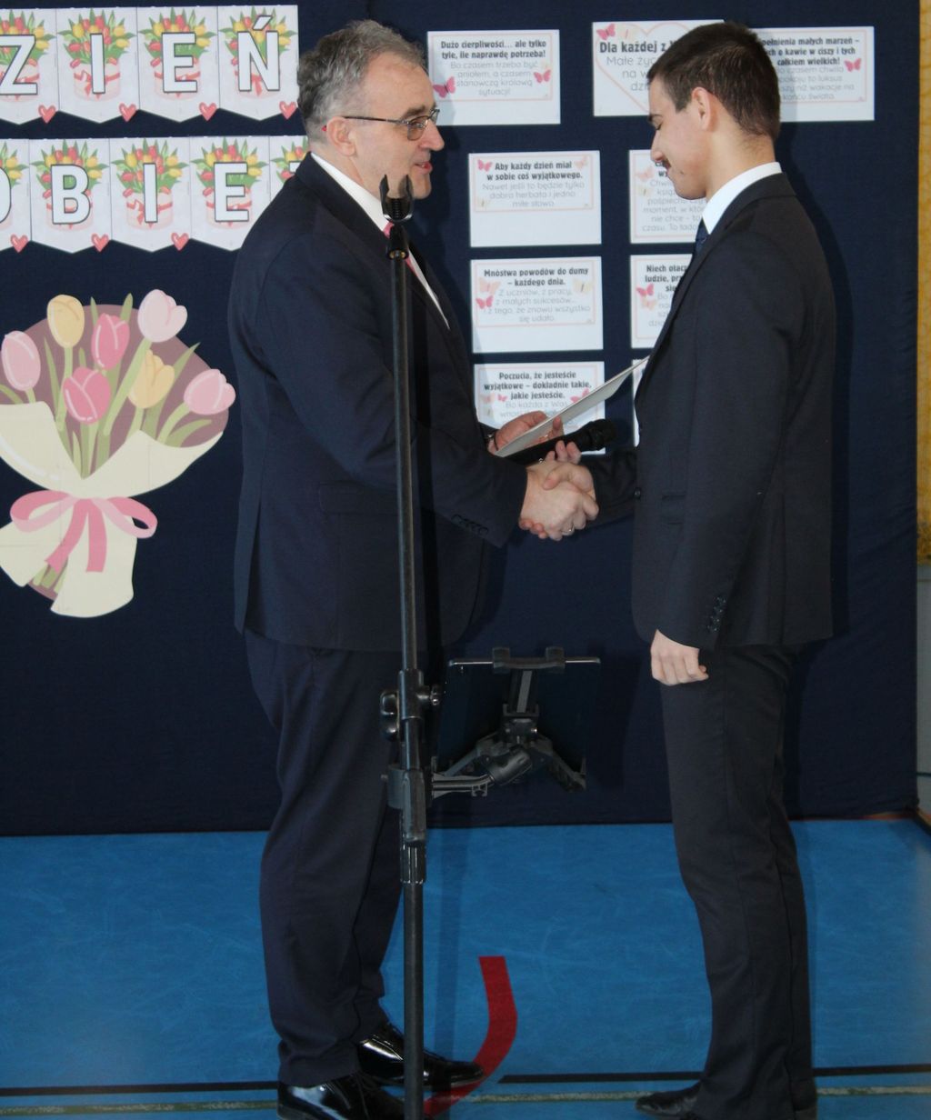 Stypendium Prezesa Rady Ministrów przyznawane jest uczniowi szkoły kształcącej w formie dziennej, która umożliwia uzyskanie świadectwa dojrzałości. Stypendium przyznaje się jednemu uczniowi danej szkoły, który otrzymał promocję z wyróżnieniem, uzyskując przy tym najwyższą w danej szkole średnią ocen lub wykazuje szczególne uzdolnienia w co najmniej jednej dziedzinie wiedzy, uzyskując w niej najwyższe wyniki, a w pozostałych dziedzinach wiedzy wyniki co najmniej dobre.W bieżącym roku szkolnym stypendium Prezesa Rady Ministrów za rok szkolny 2024/2025 zostało przyznane 235 uczniom ze szkół średnich województwa lubelskiego. Wśród nich znalazł się uczeń łukowskich „Alej”, Jakub Pietrzak z klasy IV Tel, kształcący się w zawodzie technik elektryk. Z uwagi, że nie mógł on uczestniczyć w uroczystości w Lublinie, pamiątkowy dyplom potwierdzający przyznane stypendium, odebrał teraz od Tadeusza Federczyka, dyrektora szkoły.