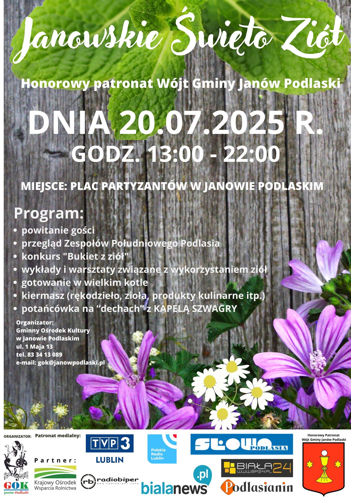 „Janowskie Święto Ziół” odbędzie się na Placu Partyzantów w Janowie Podlaskim w niedzielę, 20 lipca. Zorganizują je Wójt Gminy Janów Podlaski oraz Gminny Ośrodek Kultury. Początek zaplanowano na godzinę 10:00.