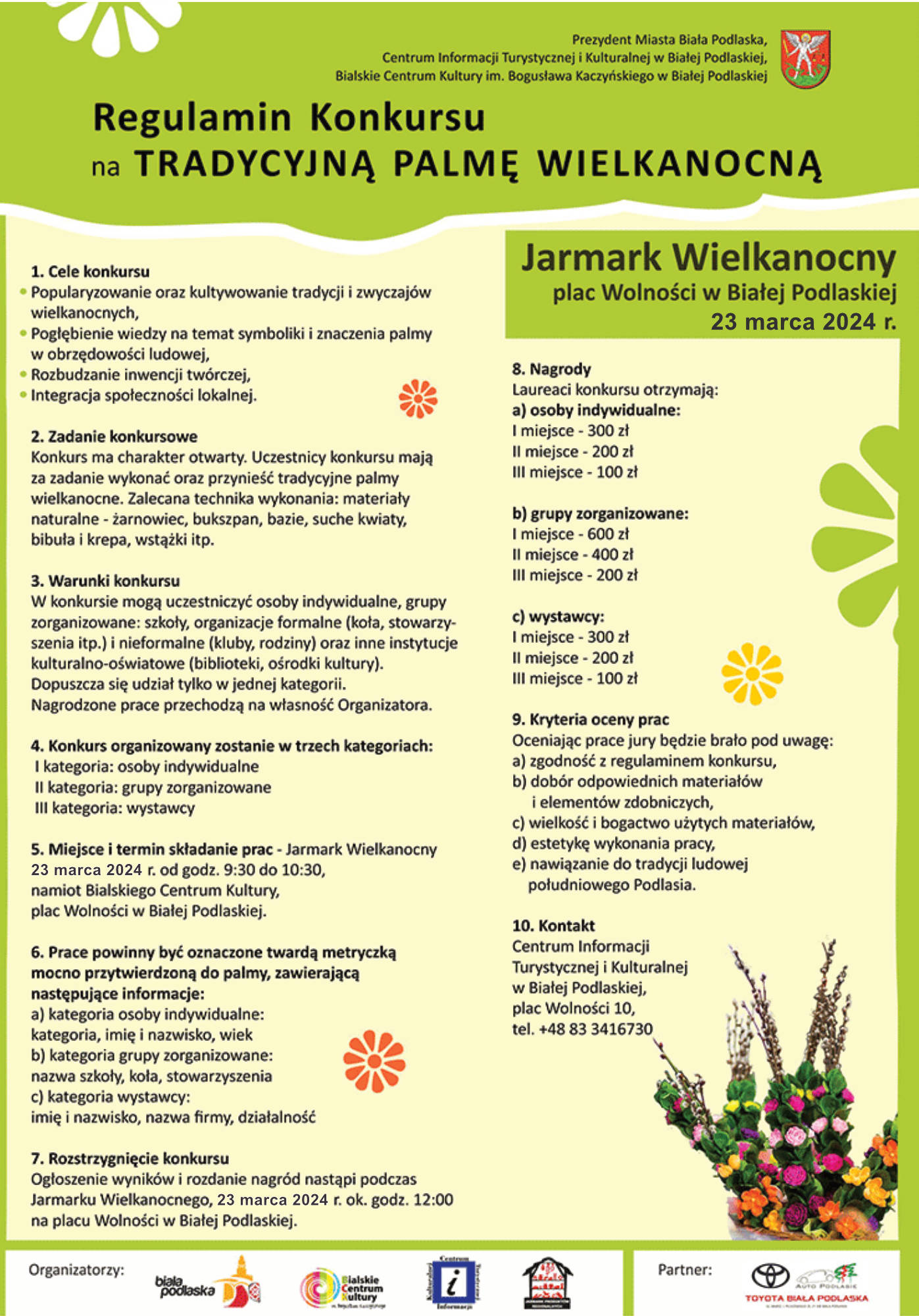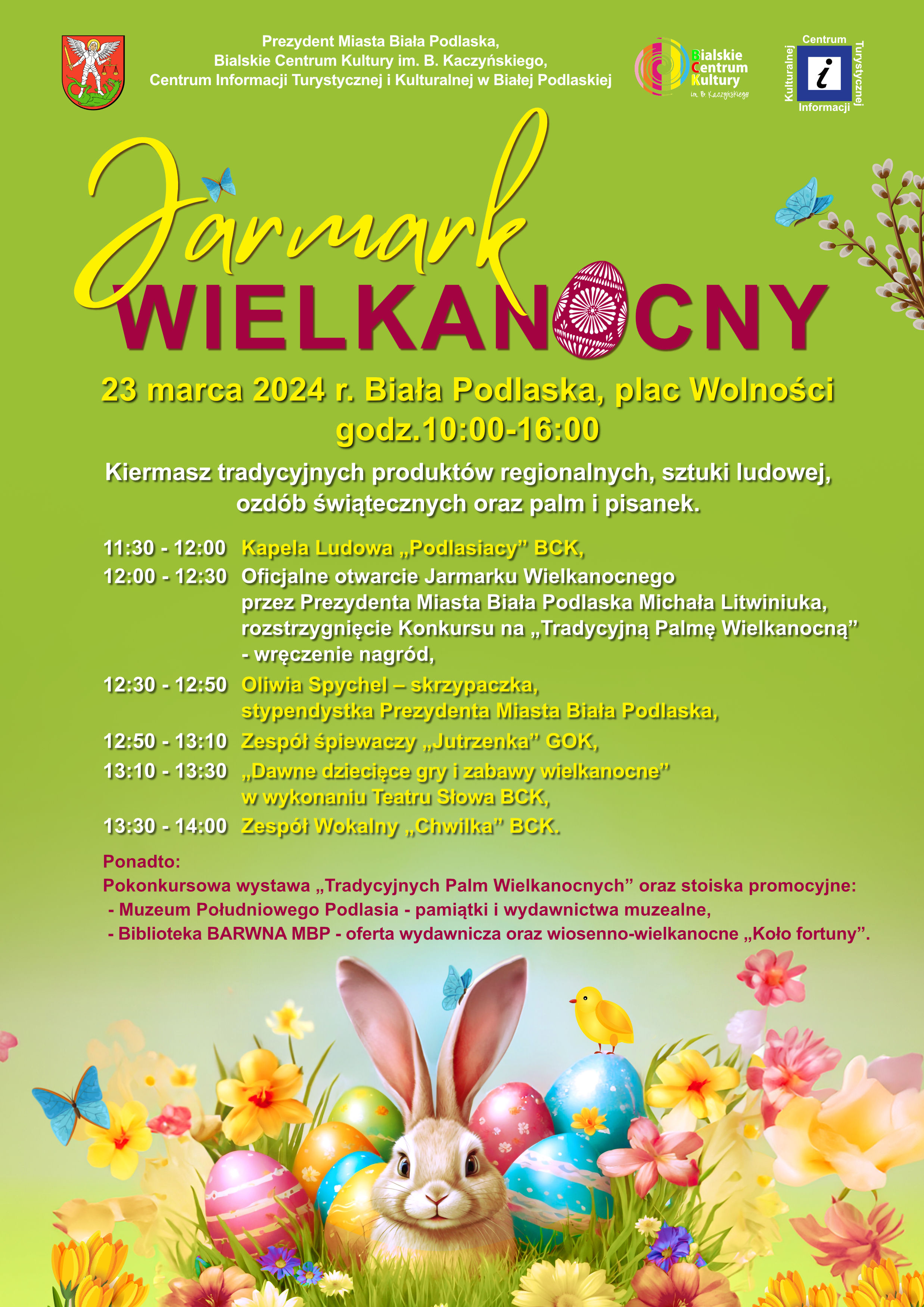 Zgłoszenia udziału w Jarmarku Wielkanocnym przyjmowane będą do 11 marca w Centrum Informacji Turystycznej i Kulturalnej w Białej Podlaskiej, plac Wolności 10, e-mail: cit@bialapodlaska.pl, tel. +48 83 341 67 30. Szczegółowe informacje oraz formularz zgłoszeniowy znajdują się na stronie: www.cit.bialapodlaska.pl.W trakcie jarmarku rozstrzygnięty zostanie konkurs na Tradycyjną Palmę Wielkanocną. Uczestnicy, aby wziąć udział w walce o nagrody muszą dostarczyć własnoręcznie wykonaną palmę do namiotu Bialskiego Centrum Kultury na Jarmarku Wielkanocnym w godzinach 9:30-10:30.