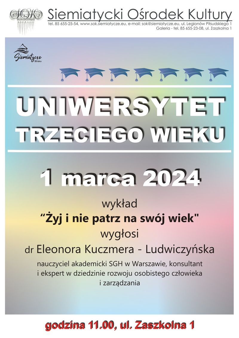 Początek zaplanowano na godzinę 11.00 w piątek, 1 marca w budynku SOK przy ul. Zaszkolnej 1.Uniwersytet Trzeciego Wieku funkcjonuje przy Siemiatyckim Ośrodku Kultury od 2012 roku. Wykłady odbywają się w ośrodku kultury raz w miesiącu. Seniorzy uczestniczą też w wybranych zajęciach dodatkowych.