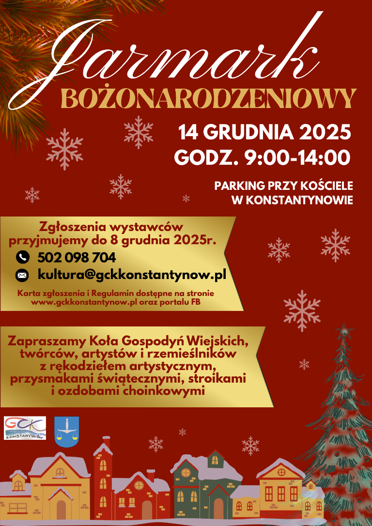Organizatorzy zachęcają do udziału osoby i podmioty oferujące m.in. rękodzieło, ozdoby świąteczne, produkty regionalne, wyroby cukiernicze czy inne artykuły idealne na świąteczne prezenty. Szczegółowe informacje dotyczące zasad zgłoszeń oraz organizacji jarmarku znajdują się na plakacie udostępnionym przez GCK.– Zachęcamy do zgłaszania swojego udziału i wspólnego budowania świątecznego klimatu – informuje Marlena Chwedoruk-Nowicka z Gminnego Centrum Kultury w Konstantynowie.