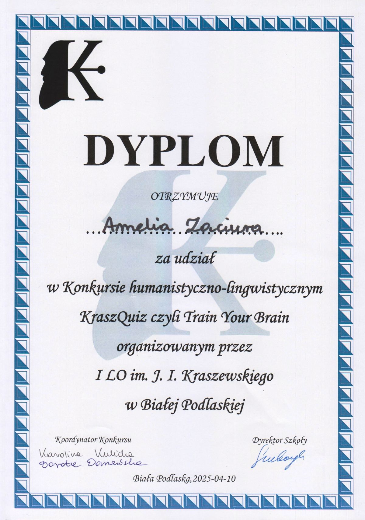 W drugim etapie Konkursu humanistyczno-lingwistycznego „KraszQuiz czyli Train Your Brain”, wzięli również udział uczniowie Szkoły Podstawowej im. Polski Niepodległejw Zalesiu – Jacek Łukanowski (VIIIa) i Amelia Zaciura (VIIIa).