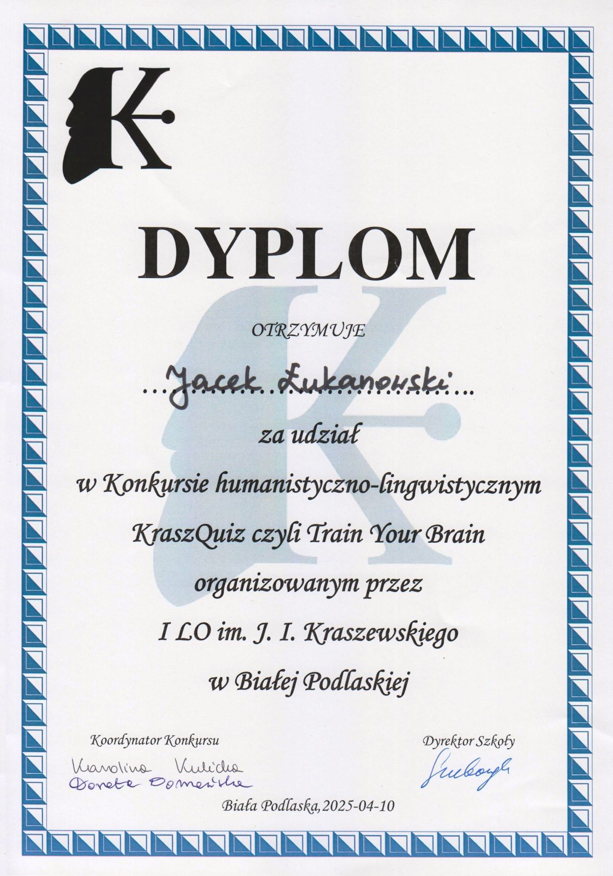 Finał dwuetapowego Konkursu humanistyczno-lingwistycznego “KraszQuiz czyli Train Your Brain”, zorganizowanego przez I Liceum Ogólnokształcące im. Józefa Ignacego Kraszewskiego w Białej Podlaskiej, odbył się 10 kwietnia w siedzibie wspomnianego I Liceum. Konkurs skierowany do uczniów klas ósmych szkół podstawowych z terenu miasta Biała Podlaska oraz powiatu bialskiego, został zorganizowany z myślą o uczniach wykazujących szczególne zdolności analizy wzrokowej, sprawności umysłowych w zakresie szybkiego czytania, znajomości ortografii i gramatyki języka polskiego, jak również kreatywności i praktycznej znajomości języka angielskiego na poziomie minimum A2.