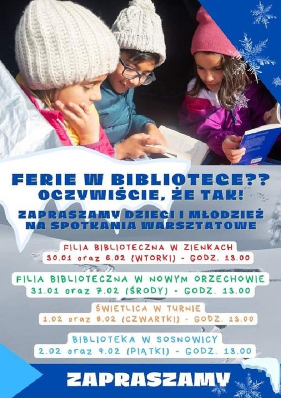 Spotkania organizowane są również w filiach biblioteki w miejscowościach Nowy Orzechów i Zienki oraz w świetlicy w Turnie.Udział w zajęciach jest bezpłatny.
