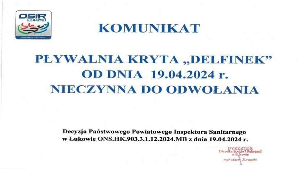 Ośrodek Sportu i Rekreacji w Łukowie informuje, że decyzją SANEPIDU zamknięta została kryta pływalnie „Delfinek” w Łukowie. Jak informuje nas dyrektor Marek Żurawski przyczyną zamknięcia jest awaria pryszniców.