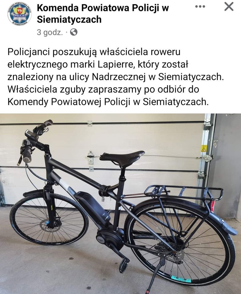 Siemiatyccy policjanci poszukują właściciela roweru elektrycznego marki Lapierre, który został znaleziony na ulicy Nadrzecznej w Siemiatyczach.
