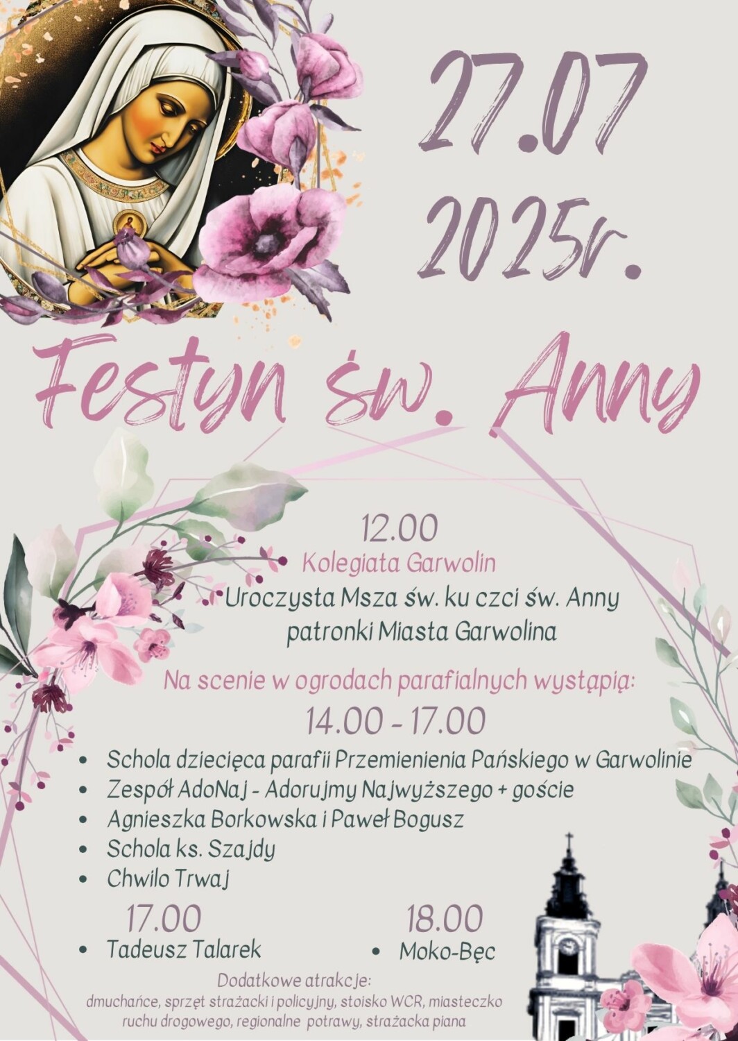 Mieszkańcy Garwolina oraz goście będą w najbliższą niedzielę, 27 lipca wspólnie świętować Dzień Świętej Anny – Patronki Miasta. Uroczystości rozpoczną się o godz. 12:00 w Kolegiacie Przemienienia Pańskiego - Mszą świętą odpustową, której przewodniczyć będzie proboszcz parafii ks. Stanisław Szymuś. Współorganizatorem obchodów jest Burmistrz Miasta Garwolin – Marzena Świeczak.