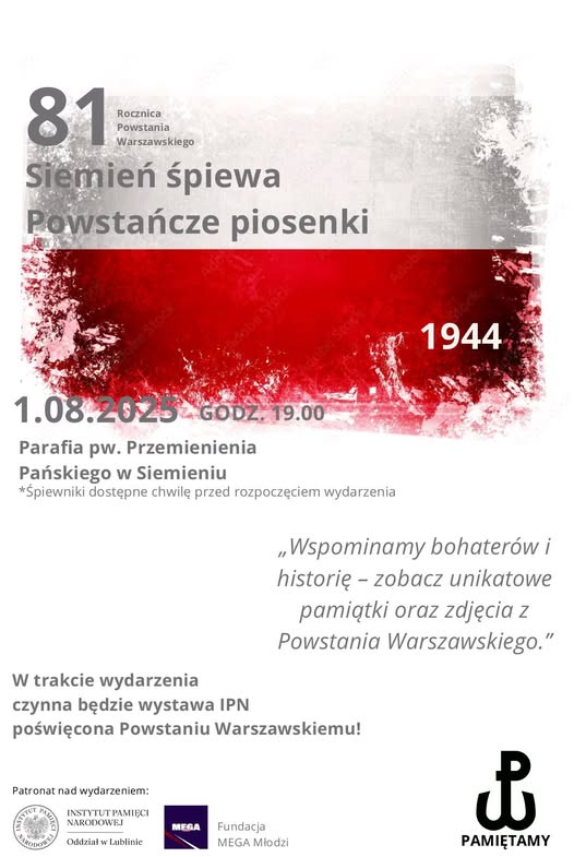 Już w piątek, 1 sierpnia, parafia Przemienienia Pańskiego w Siemieniu zaprasza na spotkanie upamiętniające bohaterów Powstania Warszawskiego. Spotkanie poprzedzi Msza święta o godz. 18:00.