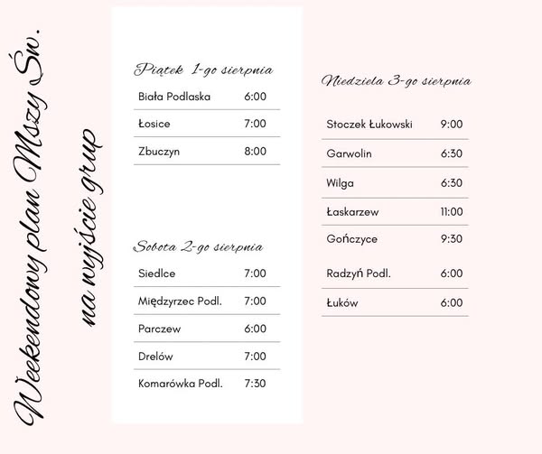 W sobotę, 2 sierpnia, po Mszy świętej sprawowanej o godz. 6:00 w Bazylice Mniejszej w Parczewie na pielgrzymi szlak wyruszą pątnicy z Parczewa. Dołączą oni do pielgrzymów z Włodawy, którzy wyruszyli do Jasnogórskiej Pani już 31 lipca.