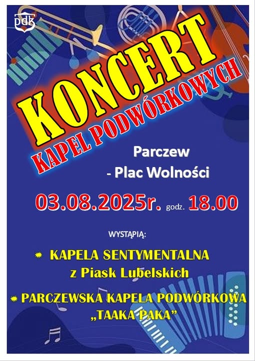 W niedzielę, 3 sierpnia, Parczewski Dom Kultury zaprasza na niezwykłe wydarzenie, Koncert Kapel Podwórkowych, które odbędzie się o godz. 18:00 na Placu Wolności w Parczewie.