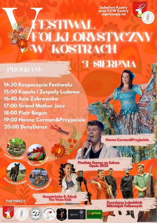 Również w najbliższą niedzielę Koło Gospodyń Wiejskich w Kostrach zaprasza serdecznie wszystkich mieszkańców powiatu na V Festiwal Folklorystyczny. Nie zabraknie kapel i zespołów ludowych oraz smacznego regionalnego poczęstunku przygotowanego przez członkinie KGW.