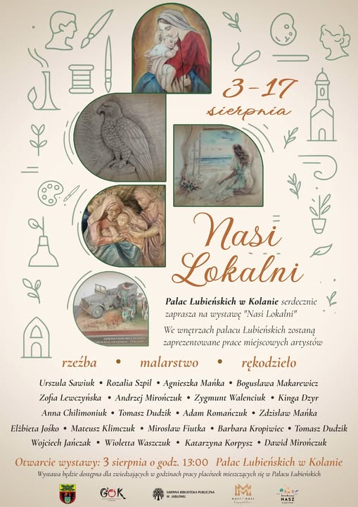 Miłośnicy sztuki tworzonej pędzlem i dłutem będą mogli spotkać się na wystawie pełnej pasji i talentu pn. „Nasi Lokalni”. Uroczyste otwarcie wystawy, na której podziwiać będzie można rzeźbę, obrazy i rękodzieło odbędzie się w niedzielę, 3 sierpnia, o godz. 13:00 w Pałacu Łubieńskich w Kolanie.