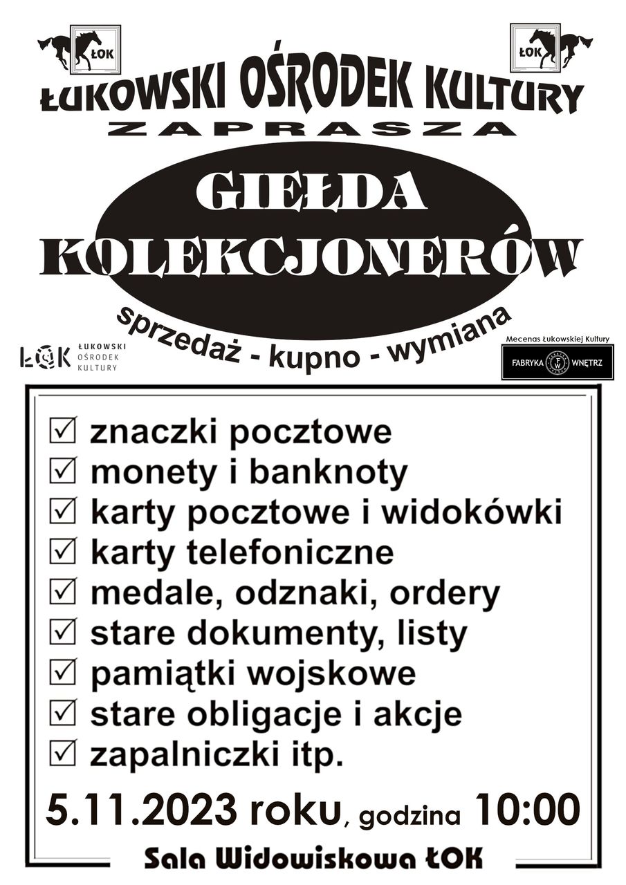 Na tym cyklicznym targowisku, będzie można kupić, wymienić, obejrzeć oraz sprzedać znaczki pocztowe, monety i banknoty, karty pocztowe i widokówki, karty telefoniczne, medale, odznaki, ordery, stare dokumenty, listy, pamiątki wojskowe, stare obligacje i akcje, zapalniczki, zegarki, telefony, lampy i inne starocia.Giełda Kolekcjonerów już w niedzielę, 5 listopada. Miejsce: sala widowiskowa ŁOK. Początek: godzina 10.00.