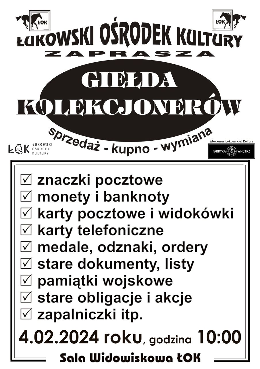 Na tym cyklicznym targowisku, będzie można kupić, wymienić, obejrzeć oraz sprzedać znaczki pocztowe, monety i banknoty, karty pocztowe i widokówki, karty telefoniczne, medale, odznaki, ordery, stare dokumenty, listy, pamiątki wojskowe, stare obligacje i akcje, zapalniczki, zegarki, telefony, lampy i inne starocia.Giełda Kolekcjonerów już w niedzielę 4 lutego od godziny 10.00 w sali widowiskowej ŁOK.