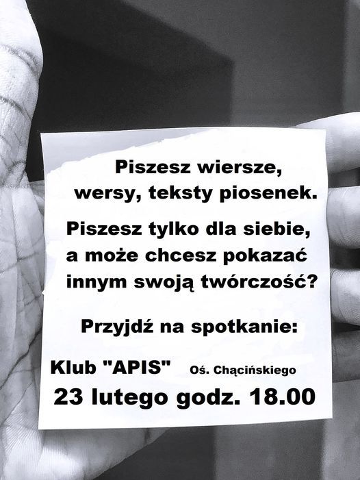 Piątkowe spotkanie w osiedlowym Klubie Apis jest dla tych, którzy piszą wiersze, wersy, czy też teksty piosenek. Być może często piszą tylko dla siebie. Ale jeżeli tylko zechcą mogą pokazać to innym. Będzie ku temu dobra okazja.
