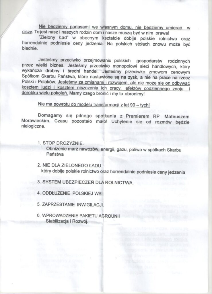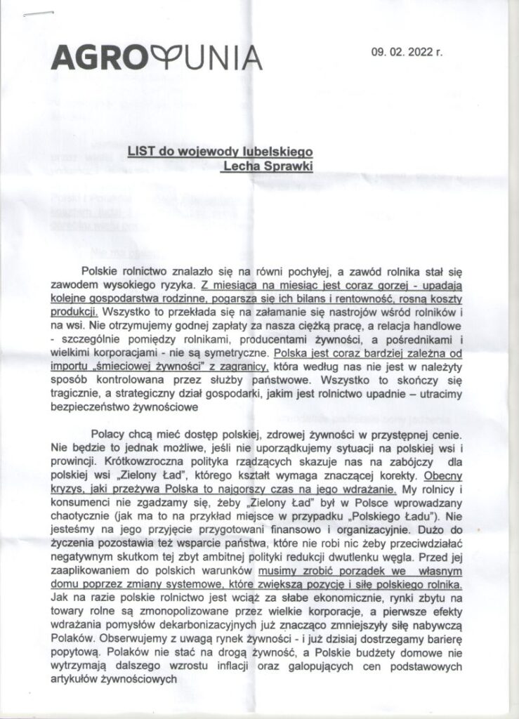 Zgodnie z zapowiedziami 9 lutego doszło do ogólnopolskiego strajku organizowanego przez Agrounię. Rolnicy z powiatu łukowskiego, do których dołączyli rolnicy z powiatów radzyńskiego i siedleckiego, o godzinie 9.00 rano wyruszyli na drogi w kierunku Łukowa. Miejscem, w którym się spotkali był plac targowiska przy ul. Prusa. Tam Jarosław Wojtaszak, koordynator Agrounii w powiecie łukowskim, przedstawił postulaty protestujących. Były wśród nich żądania m.in. spotkania z premierem Mateuszem Morawieckim, umożliwienie rolnikom sprzedaży ich produktów do supermarketów oraz stworzenia rolnikom systemu ubezpieczeń. „To jest nasz krzyk rozpaczy. Nie chcemy umierać w ciszy, jak w latach '90. Potrzebujemy pomocy” - mówił Jarosław Wojtaszak:Obecni na strajku rolnicy podpisali się również pod listem do wojewody lubelskiego Lecha Sprawki. Opisali w nim swoją sytuację. W liście zwrócili też uwagę na to, że ich produkcja jest coraz mniej opłacalna, że ponoszą coraz wyższe koszty związane z cenami za nawozy i opłatami za energię i paliwo. W liście tym czytamy także: „Nie będziemy pariasami we własnym domu, nie będziemy umierać w ciszy (…) jesteśmy przeciwko przejmowaniu polskich gospodarstw rodzinnych przez wielki biznes. Jesteśmy przeciwko monopolowi sieci handlowych, który wykańcza drobny i średni handel. Jesteśmy przeciwko zmowom cenowym Spółek Skarbu Państwa, które nastawione są na zysk, a nie na pracę na rzecz Polski i Polaków”.