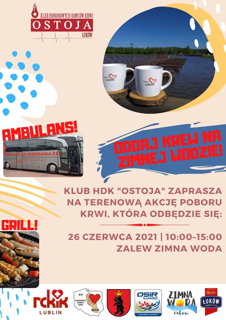 Klub Honorowych Dawców Krwi „Ostoja” w Łukowie organizuje w sobotę 26 czerwca terenową akcję poboru krwi pod hasłem „Oddaj krew na Zimnej Wodzie”. Akcja odbędzie się w dniu otwarcia kompleksu.
