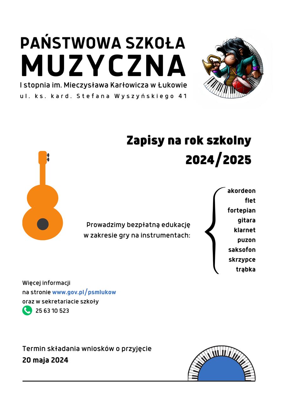 Państwowa Szkoła Muzyczna I stopnia w Łukowie rozpoczęła zapisy uczniów do klas pierwszych na rok szkolny 2024/2025. Czas na złożenie wniosku o przyjęcie do szkoły mija 20 maja.