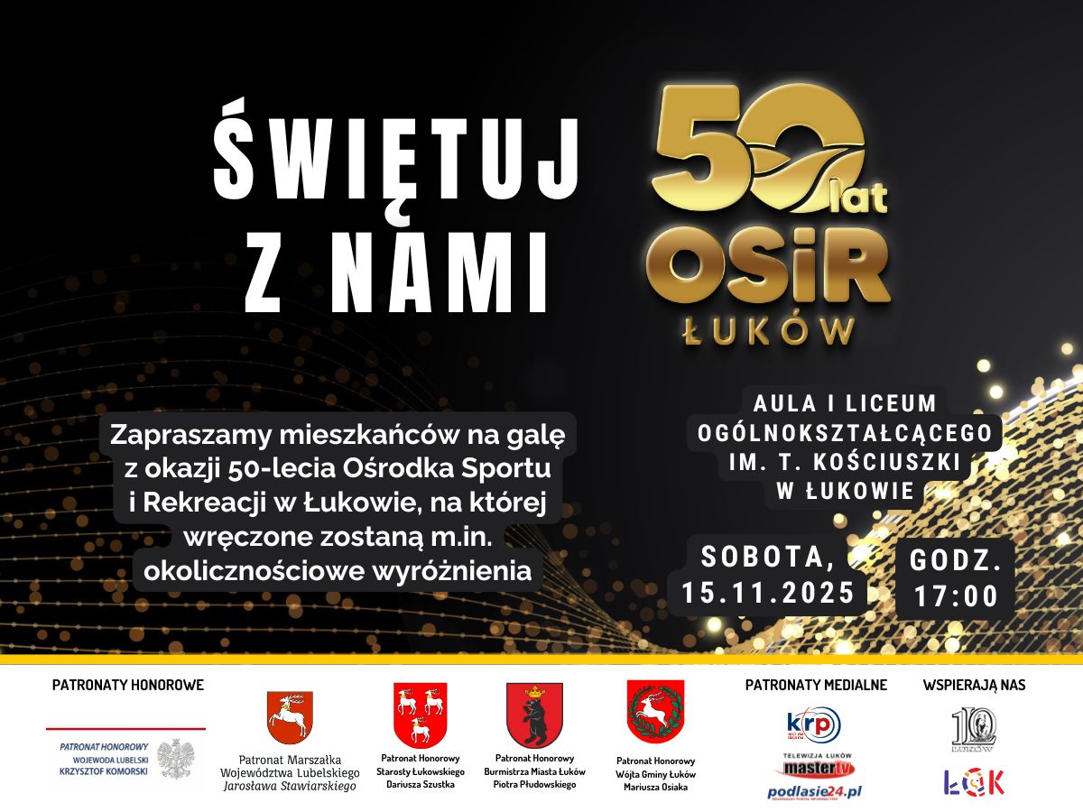 Jubileuszowa gala będzie okazją do podsumowania pięciu dekad działalności łukowskiego OSiR – instytucji, która kształtuje sportowy charakter miasta. Podczas gali zaprezentowana zostanie historia Ośrodka Sportu i Rekreacji oraz uhonorowani zostaną zasłużeni pracownicy, działacze, partnerzy i osoby wspierające rozwój sportu i rekreacji w Łukowie.Honorowy patronat nad Jubileuszową Galą 50-lecia OSiR Łuków objęli: wojewoda lubelski Krzysztof Komorski, marszałek województwa lubelskiego Jarosław Stawiarski, starosta łukowski Dariusz Szustek, wójt gminy Łuków Mariusz Osiak oraz burmistrz Łukowa Piotr Płudowski. Patronat medialny sprawują Katolickie Radio Podlasie oraz portal Podlasie24.