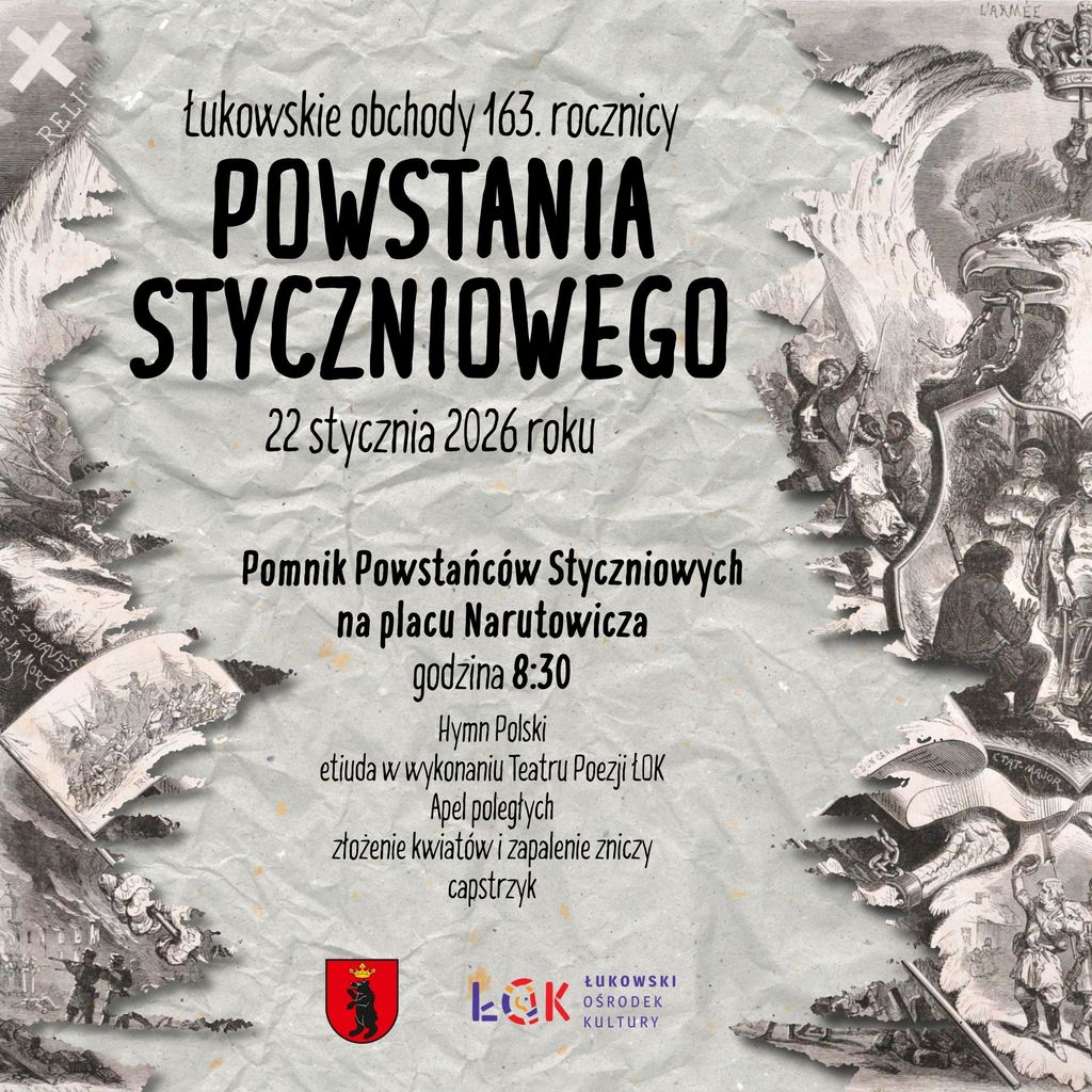 Łukowskie obchody 163. rocznicy wybuchu Powstania Styczniowego organizują: burmistrz, Rada Miasta i Łukowski Ośrodek Kultury. W programie spotkania, które odbędzie się na Placu Narutowicza przy pomniku Pamięci Powstańców Łukowian, zaplanowano: odśpiewanie hymnu Polski, etiudę w wykonaniu Teatru Poezji ŁOK, Apel Poległych, złożenie kwiatów i zapalenie zniczy oraz capstrzyk.Spotkanie przy pomniku odbędzie się w czwartek, 22 stycznia. Rozpocznie się o godzinie 8:30.