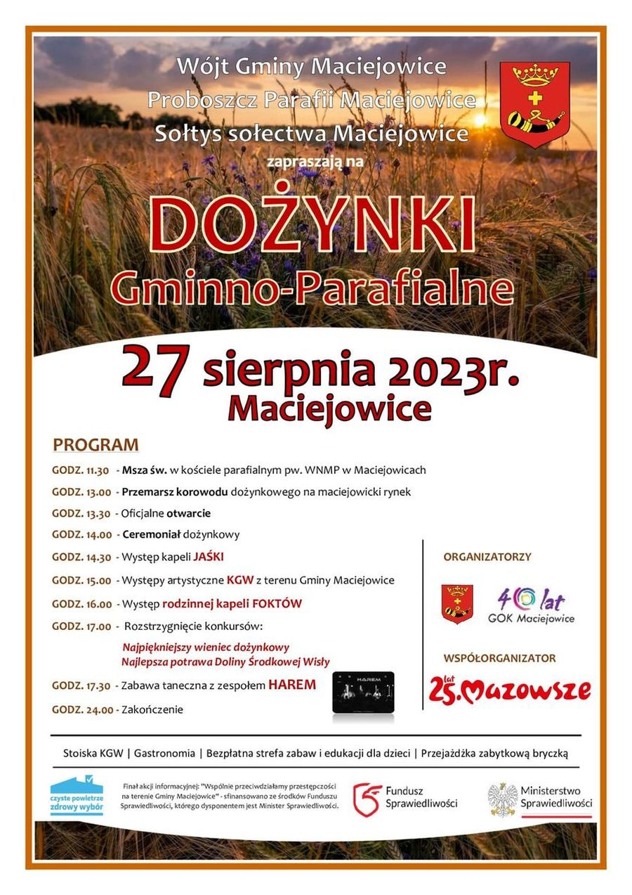 Dożynki to jedno z najpiękniejszych świąt rolników, będące ukoronowaniem ich całorocznego trudu. Tegoroczne dziękczynienie za plony w gminie Maciejowice odbędzie się 27 sierpnia i tradycyjnie będzie doniosłym wydarzeniem.