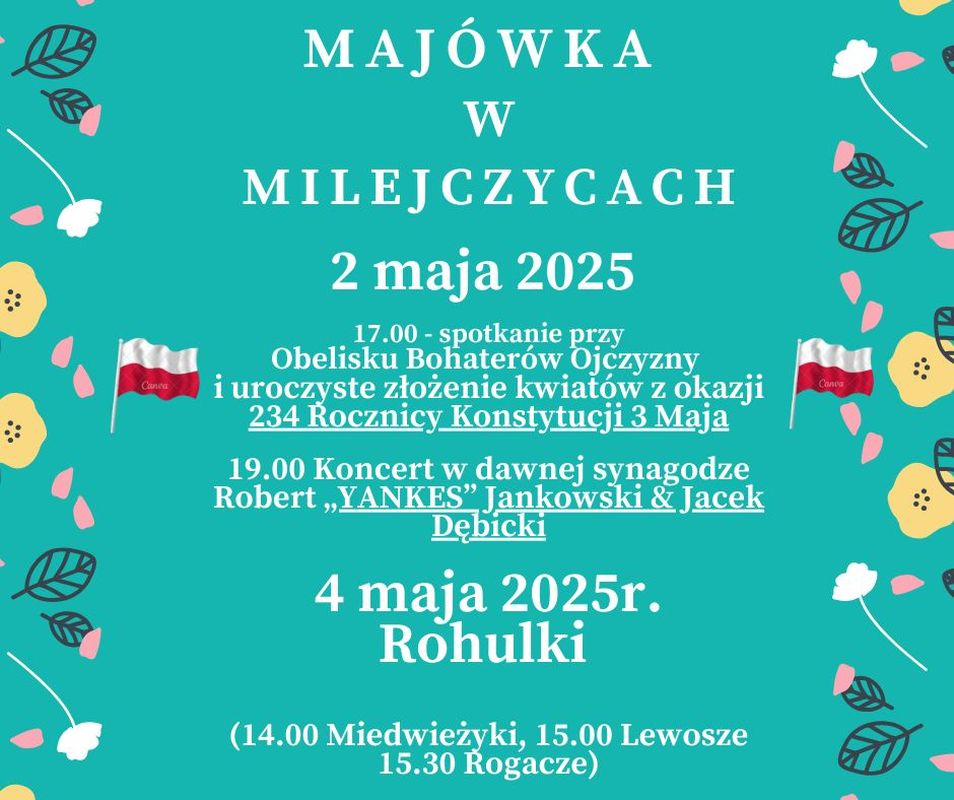 Gmina Milejczyce zaprasza mieszkańców i gości na majówkę pełną wydarzeń kulturalnych i patriotycznych. W programie znajdą się uroczystości z okazji rocznicy uchwalenia Konstytucji 3 Maja, koncerty oraz obchody prawosławnych tradycji wiosennych.