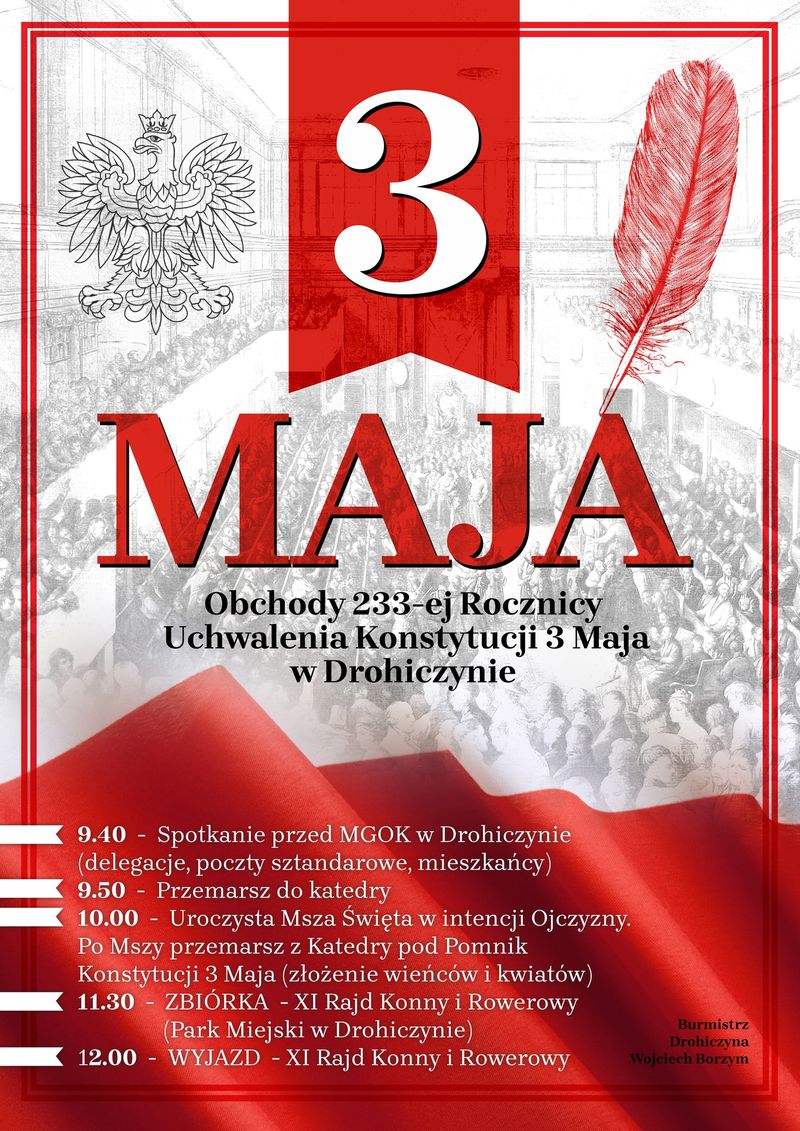 W ramach obchodów rocznicy uchwalenia Konstytucji 3 Maja, w Drohiczynie odbędą się uroczystości, które rozpocznie Msza Św. w katedrze o godzinie 10:00.