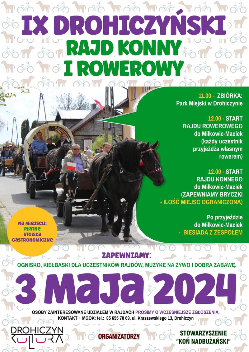 12.00 - wyjazd Rajdu Konnego i Rowerowego z Drohiczyna do Miłkowic Maciek, gdzie odbędzie się biesiada przy muzyce na żywo.