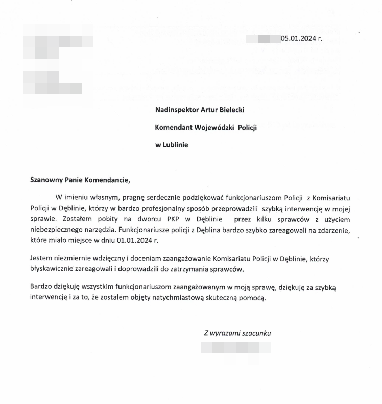 List mężczyzny dotyczył sprawy z 1 stycznia 2024 roku. Policjanci z Dęblina otrzymali zgłoszenie, że na dworcu PKP doszło do pobicia młodego mężczyzny. Dzięki podjętym działaniom dęblińskich funkcjonariuszy już kolejnego dnia ustalili i zatrzymali sprawców pobicia. Okazali się nimi dwaj 23-latkowie, 18-latek i 17-latek. Powodem pobicia mogła być sytuacja z zabawy sylwestrowej podczas, której poszkodowany stanął w obronie koleżanki. Zatrzymani usłyszeli zarzuty w tej sprawie.