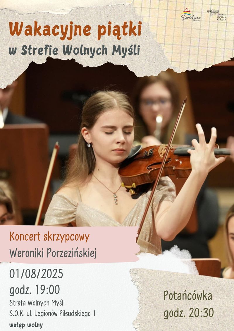 W Siemiatyczach po raz kolejny zaplanowano spotkanie z cyklu „Wakacyjny piątek w Strefie Wolnych Myśli” przy ul. Legionów Piłsudskiego 1 – w piątek, 1 sierpnia, o godz. 19.00 z koncertem skrzypcowym wystąpi utalentowana siemiatyczanka Weronika Porzezińska. Po koncercie – potańcówka.